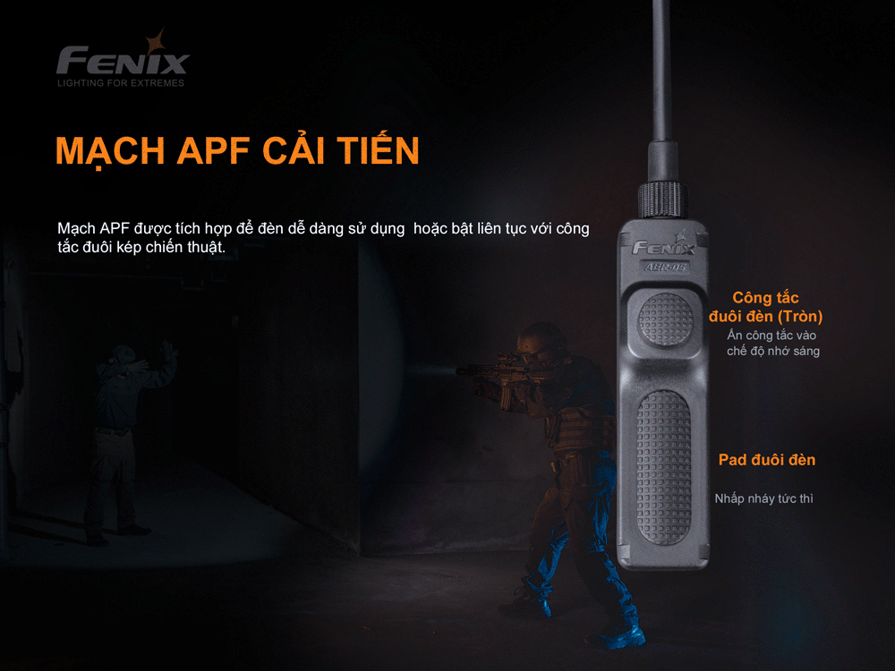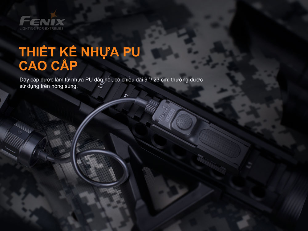 Công tắc chiến thuật FENIX AER-05 là một công tắc chuyên dụng dành riêng cho đèn pin Fenix tá-c ch-iế-n có sử dụng mạch APF. Sử dụng công tắc kép cho phép người dùng có thể điều khiển bật tắt liên tục duy trì bật liên tục. Công tắc được làm từ PU có độ đàn hồi cao với chiều dài 9 ”/ 23cm phù hợp với hầu hết các loại nòng s-ú-ng. Tương thích với đèn pin sử dụng pin 21700, chẳng hạn như Fenix TK16 V2.0, TK28 TAC, PD36 TAC, v.v...
