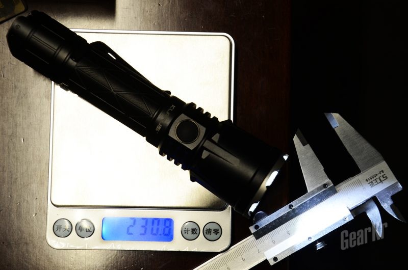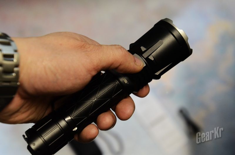 XT21X sử dụng pin 21700, thân đèn dài hơn và to hơn pin 18650 một chút, cảm giác cầm nắm là rất thoải mái. Đường kính đầu đèn chỉ lớn hơn thân 1 chút, đủ để nắm chắc chắn trong tay, giữ cây đèn ổn định và không bị tuột. Ngón cái cũng rất thoải mái để bấm và thao tác công tắc bên.