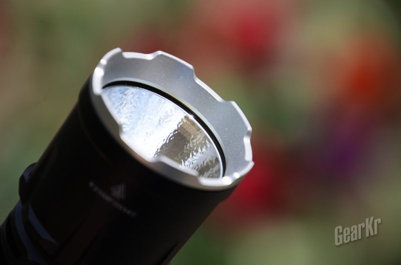 Đầu đèn được gắn 1 vòng bezel bằng thép cứng không gỉ, có nhiệm vụ chính là bảo vệ kính, chóa và Led. Bezel có 6 răng ngắn bố trí đều và đối xứng với nhau, tạo thành răng t-ấn cô-ng, không quá dữ dằn nhưng cũng rất hiệu quả trong các tình huống đối kháng trực tiếp.
