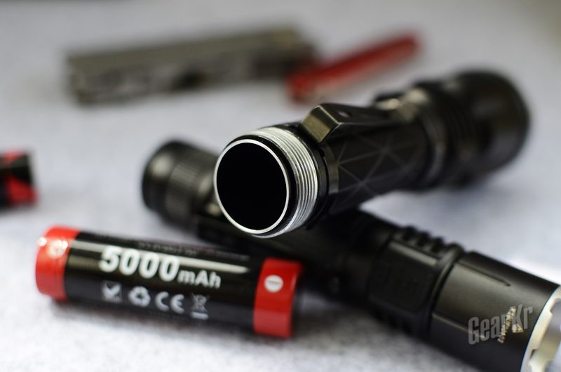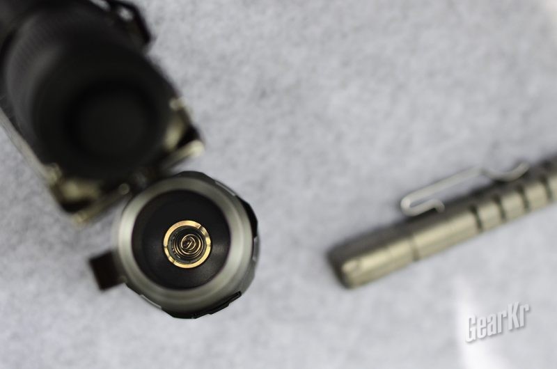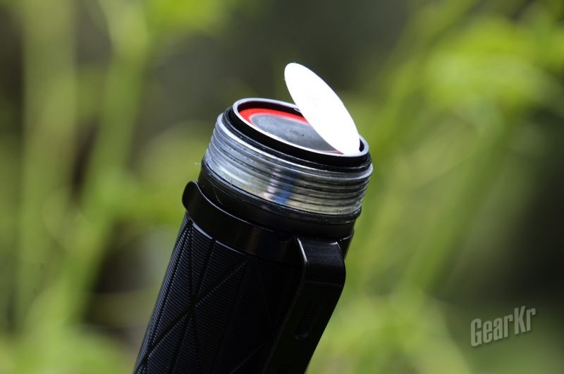 Mở nắp đuôi ra, ta có thể thấy 1 miếng cách điện được đặt ở cực âm của pin, đảm bảo an toàn khi lưu trữ đèn cũng như vận chuyển, tránh kích hoạt đèn ngoài ý muốn. Vòng o-ring chống nước ở mối ren khá dày, khiến cho nắp đuôi rất chặt khi tháo lắp qua đoạn oring đó. Khi ta vặn đuôi, lực ma sát có thể cảm nhận được rõ ràng, nó khiến cho o-ring cao su bị nén chặt, khiến cho khoang pin và bên ngoài được hoàn toàn cách li, chống nước 100%.