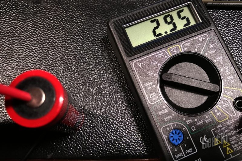 Tôi tháo pin ra khỏi đèn, đo diện áp thì pin còn 2.95V. Mạch bảo vệ đã hoạt động, bảo vệ pin lithium khỏi bị quá xả.