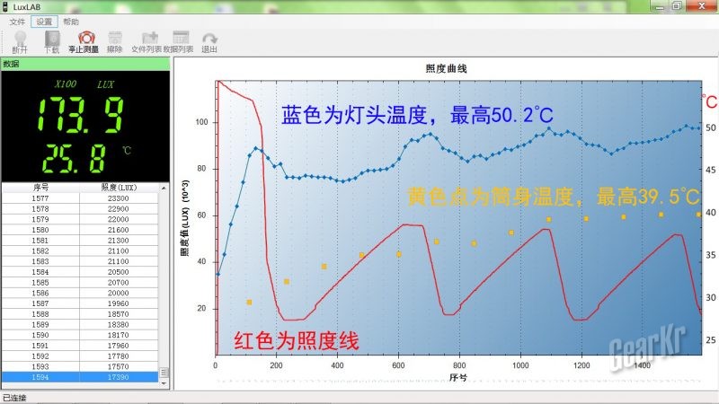 Cùng trên đồ thị thời gian chiếu sáng tương quan với độ rọi đo được, tôi bổ sung đường đặc tính nhiệt độ theo thời gian. Và do đó mỗi tương quan giữa nhiệt độ và độ sáng cũng được thấy rõ ràng. XT21X có hệ thống bảo vệ nhiệt độ thông minh ITS. Khi bật sáng turbo, nhiệt độ của đầu đèn tăng nhanh chóng, đạt 47.5 độ rồi mới giảm sáng. Sau khi giảm sáng, nhiệt của đầu đèn cũng giảm mạnh, rồi đèn lại tăng sáng, nhiệt độ cũng dần dần tăng theo. Ta có thể thấy độ sáng và nhiệt độ của đèn cùng tăng và cùng giảm, về tổng thể, xu hướng của nhiệt độ là tăng nhẹ.