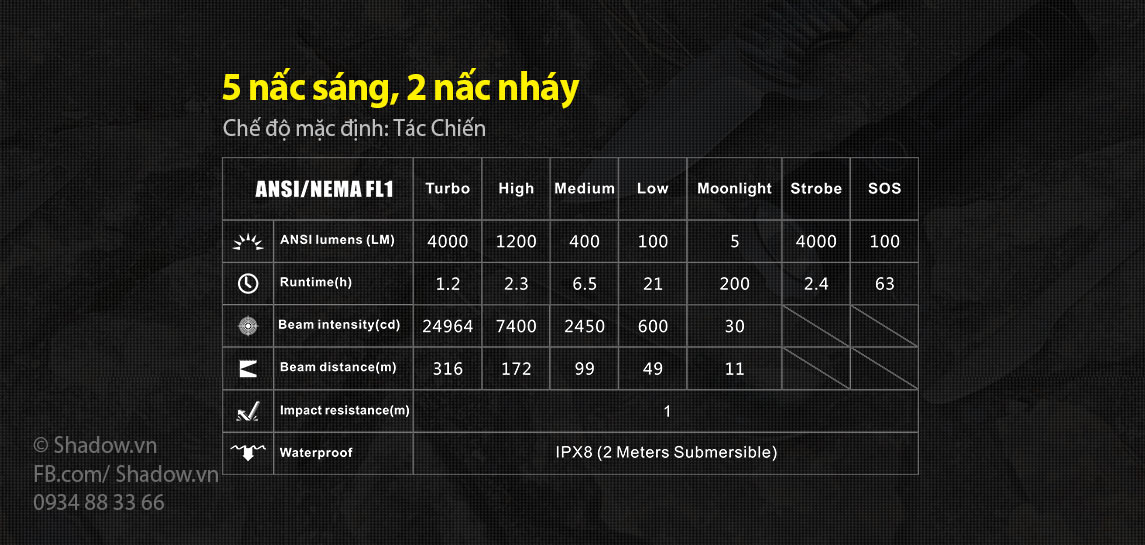 Turbo 110000lux, High 35500lux, Medium 10280lux, Low 2620lux, Moonlight 176lux. Độ sáng tương ứng theo thông số nhà sản xuất là 4000, 1200, 400, 100, and 5 lumens. Bố trí các nấc sáng của XT21X theo tôi đánh giá là hợp lý và phù hợp với các điều kiện chiếu sáng khác nhau.