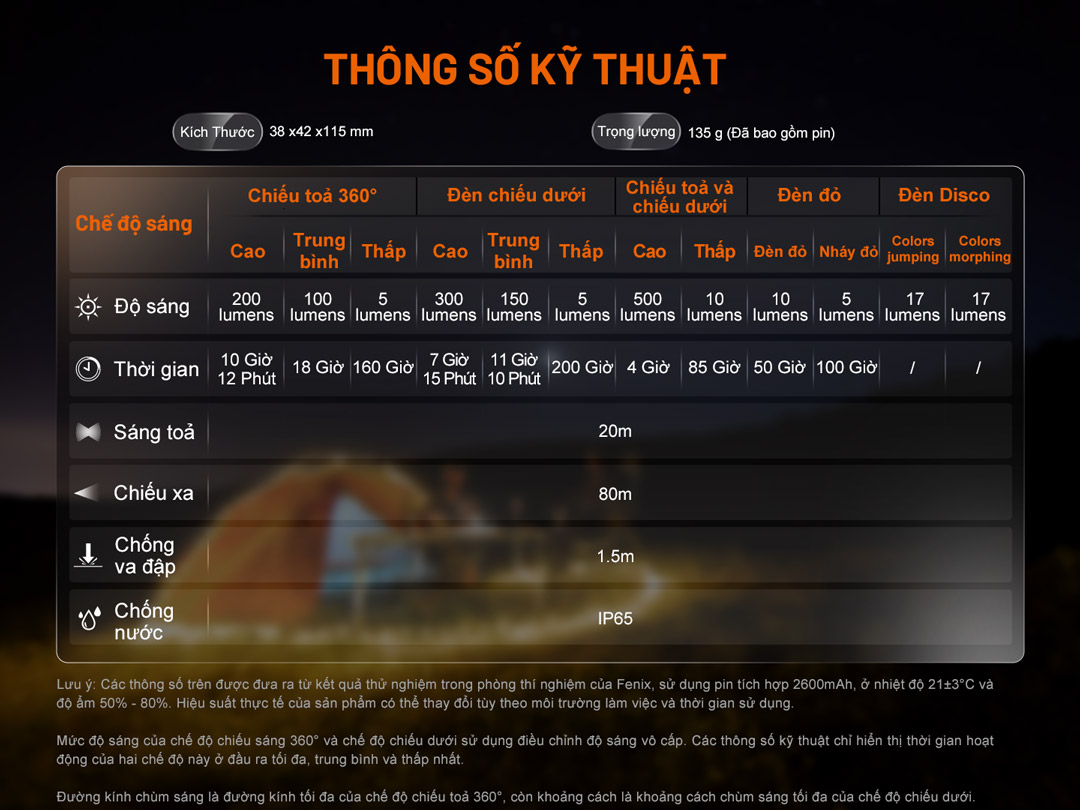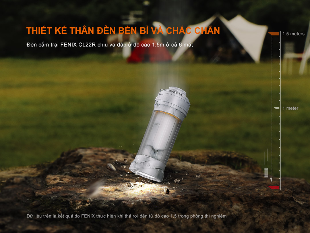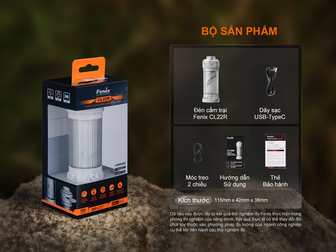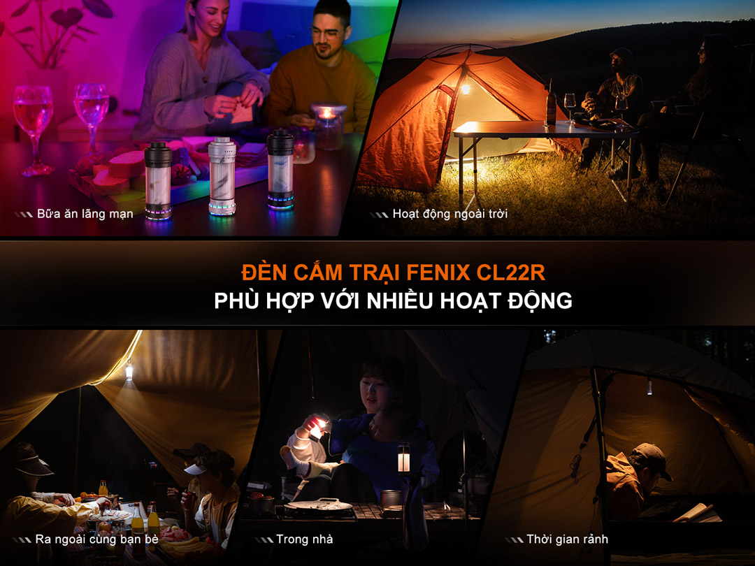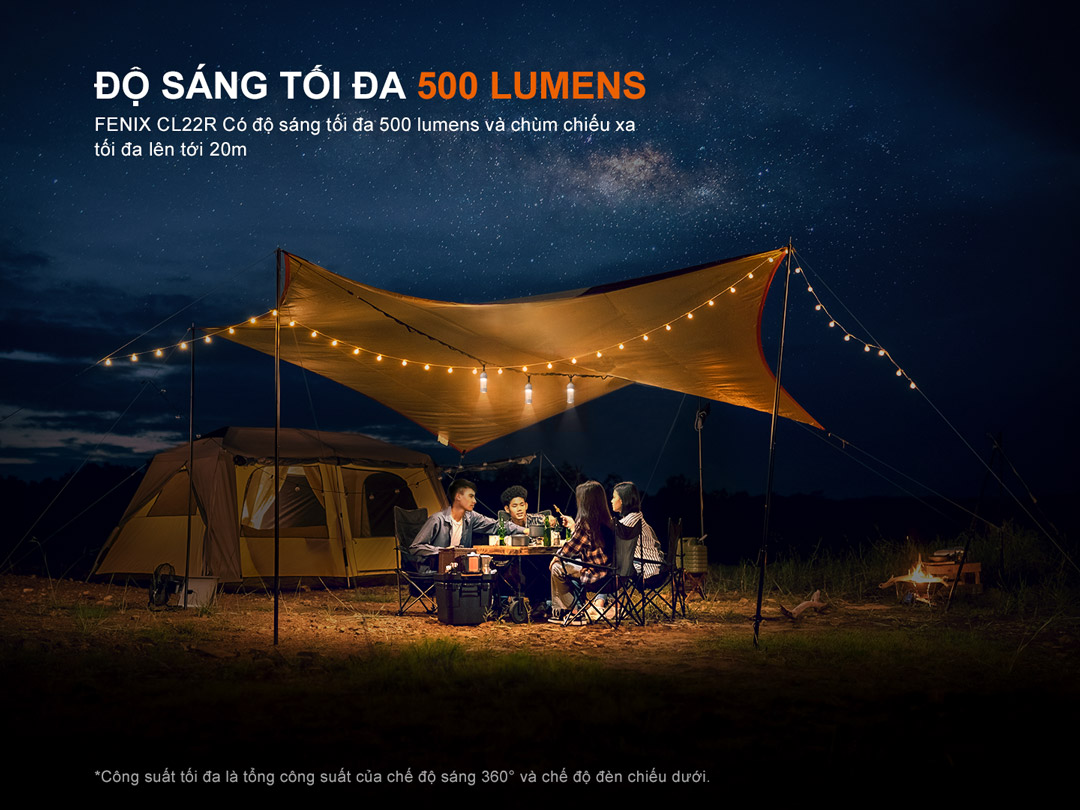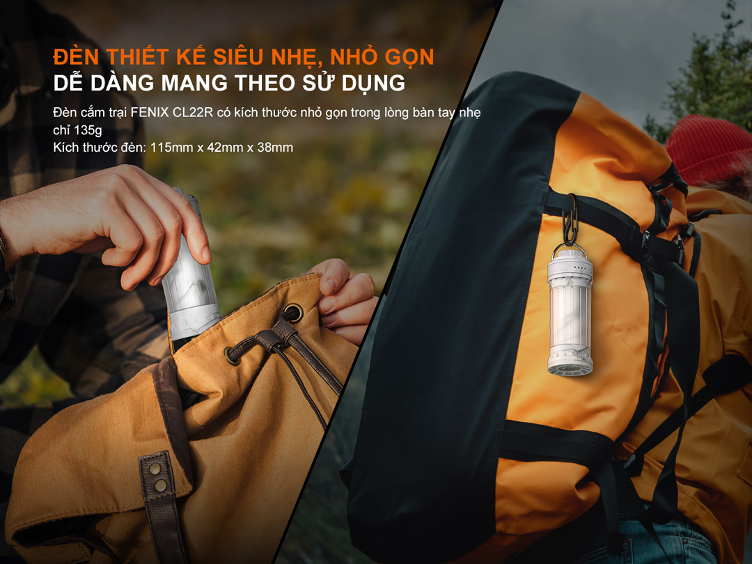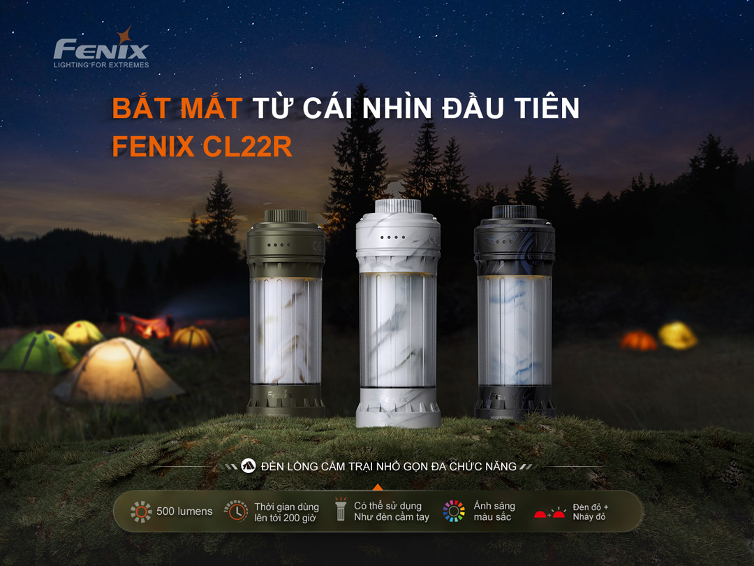 Đèn cắm trại Fenix CL22R với thiết kế nhỏ gọn và tiện lợi, sự lựa chọn hoàn hảo cho hoạt động cắm trại và leo núi. Đèn có độ sáng 500 lumen , góc chiếu toả 360° chiếu sáng toàn bộ khu vực, có LED phụ dưới thân,có thể dùng làm đèn cầm tay ánh sáng đủ mạnh để soi rõ mọi vật xung quanh. Núm xoay trên đầu đèn giúp điều chỉnh độ sáng. Cũng có thể chuyển qua chế độ đèn đỏ, đèn nháy đỏ và chế độ ánh sáng Disco, tạo không khí vui tươi trong lều. Nhờ thiết kế nhẹ và khả năng chống bụi/nước IP65, CL22R là người bạn đồng hành lý tưởng cho mọi chuyến đi.