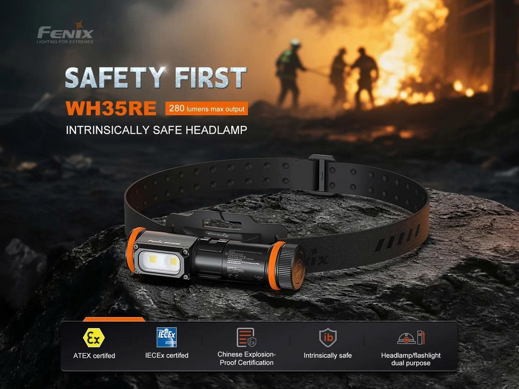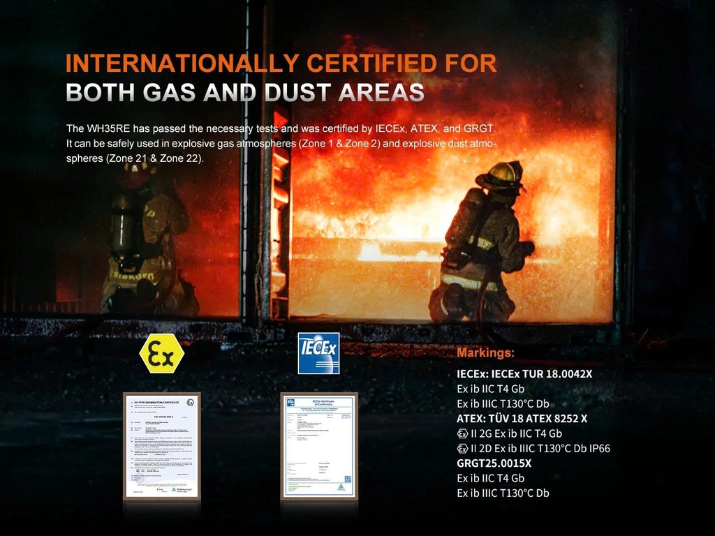 Fenix WH35RE là chiếc đèn gù đội đầu công nghiệp chống cháy nổ được thiết kế đặc biệt cho môi trường làm việc nguy hiểm như dầu khí, hoá chất, nhiệt điện, luyện kim hay các khu vực có khí dễ nổ và bụi cháy. Sản phẩm đạt các tiêu chuẩn an toàn quốc tế IECEx, ATEX và GRGT, giúp bạn yên tâm sử dụng trong Zone 1/Zone 2 (khí) và Zone 21/Zone 22 (bụi) mà không lo rủi ro.