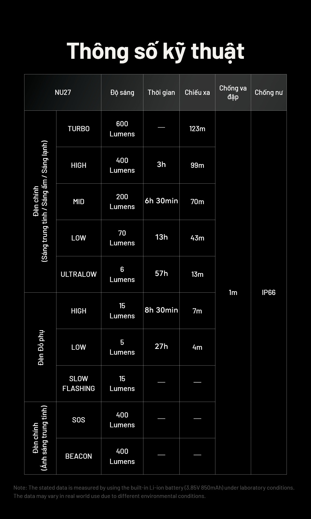 Sáng 600lm chiếu xa 123m
