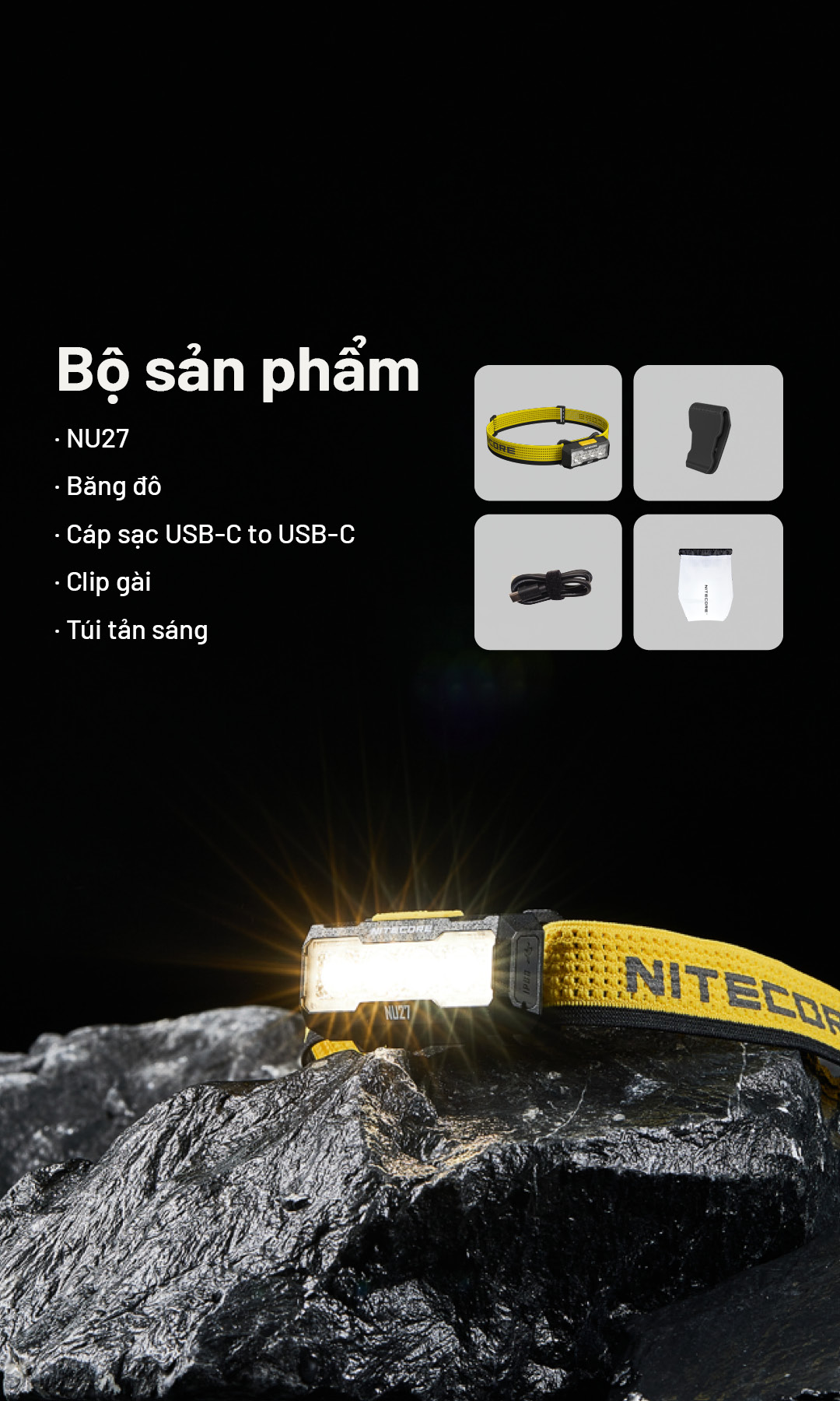 Bộ sản phẩm Đèn đeo đầu NU27 bao gồm