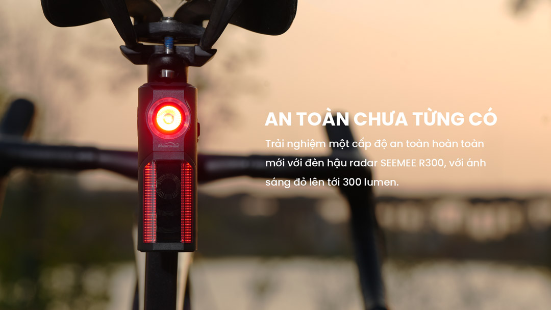 Đèn hậu xe đạp MAGICSHINE SEEMEE R300 là đèn hậu cảnh báo ánh sáng đỏ gắn ở yên xe đạp, có độ sáng 300 lm và tầm nhận diện đạt đến 2400m. Điểm đặc biệt của SEEMEE R300 là được trang bị radar có thể nhận biết được vật đang tới gần trong khoảng cách 140m, sở hữu tính năng nháy đồng bộ và có khả năng tương thích với các loại đồng hồ xe đạp khác nhau, điện thoại di động.... Vị trí thích hợp nhất để gắn đèn là dưới yên, trên cốt yên xe đạp, rất thuận tiện trong hoạt động sử dụng hằng ngày trong đô thị, đi đường rừng, đạp xe touring đường trường,...