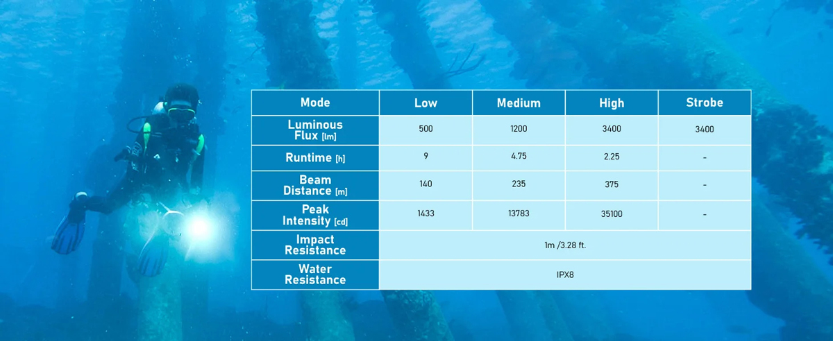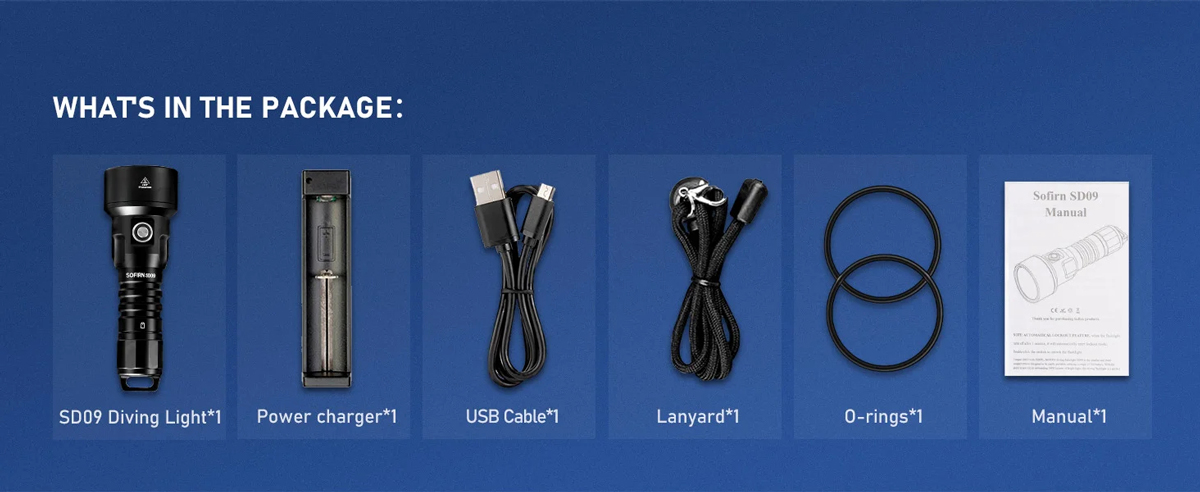 Đèn pin SOFIRN SD09 là một cây đèn pin lặn biển rất dễ sử dụng với một công tắc nút bấm trên thân. Đèn có độ sáng 3.400 lumen, tầm chiếu xa 375m, sử dụng pin sạc 21700 dung lượng 4.000mAh, có thể chịu độ sâu tối đa lên đến 100m. Sofirn SD09 thườngd được sử dụng để lặn biển dân dụng, hàng ngày.... hỗ trợ các ngư dân.
