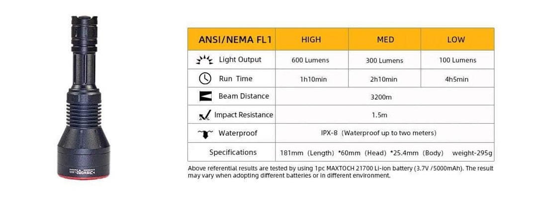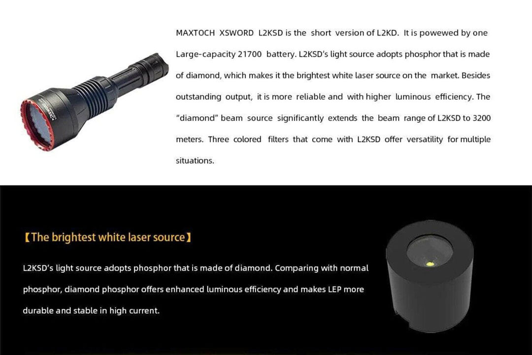 Đèn laser MAXTOCH L2KSD là phiên bản nhỏ gọn hơn của mẫu đèn L2KD với tầm chiếu xa đạt 3.200m và độ sáng tối đa là 650 lumen, sử dụng pin Li-ion 21700 5000 mAh tích hợp, thời gian chiếu sáng có thể lên tới 9 giờ 10 phút ở mức sáng thấp nhất. Với tầm chiếu cực xa, đèn laser L2KSD thích hợp trong việc s-ăn b-ắn, hả-i quâ-n, b-iên p-hòng, qu-ân s-ự,...
