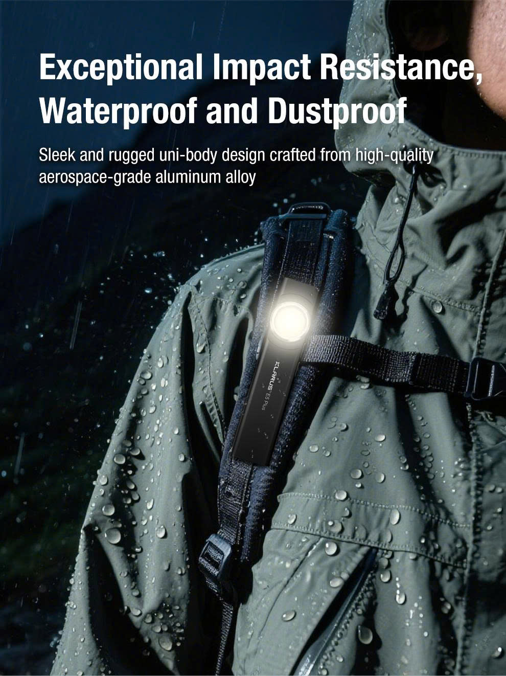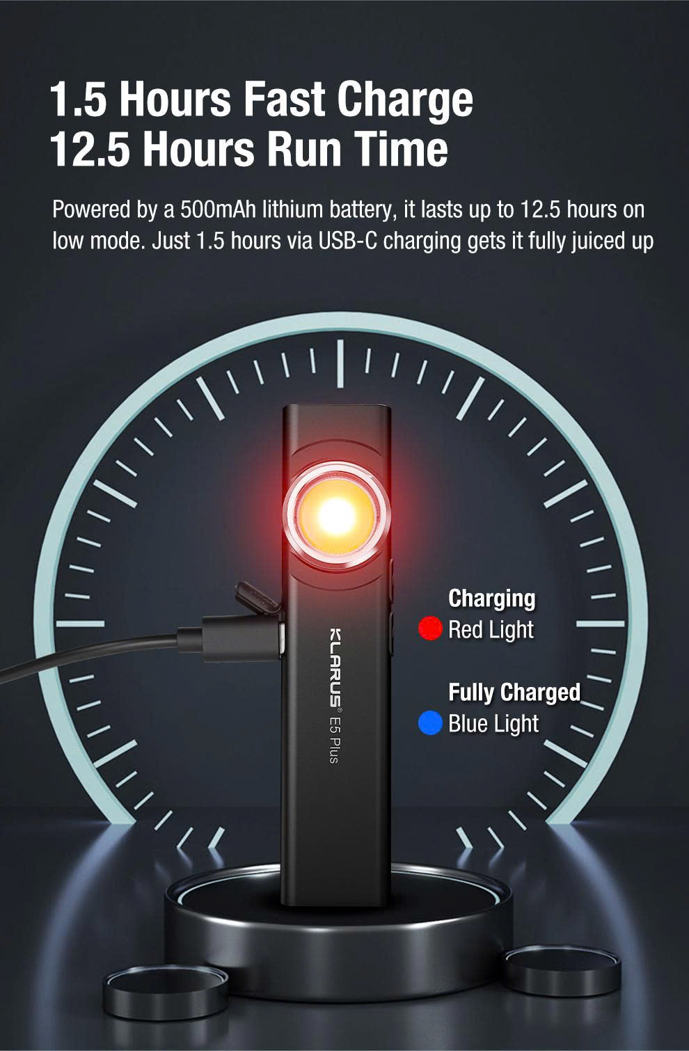 KLARUS E5 PLUS là đèn pin EDC siêu mỏng nhẹ, độ sáng 650 lumen, tích hợp đèn phụ chiếu gần và xa. Thiết kế nam châm + kẹp áo tiện dụng, pin 500mAh sạc nhanh qua Type-C, thời gian chiếu sáng đến 12 giờ. Phù hợp mang theo hằng ngày, du lịch, sửa chữa và sử dụng trong nhà.