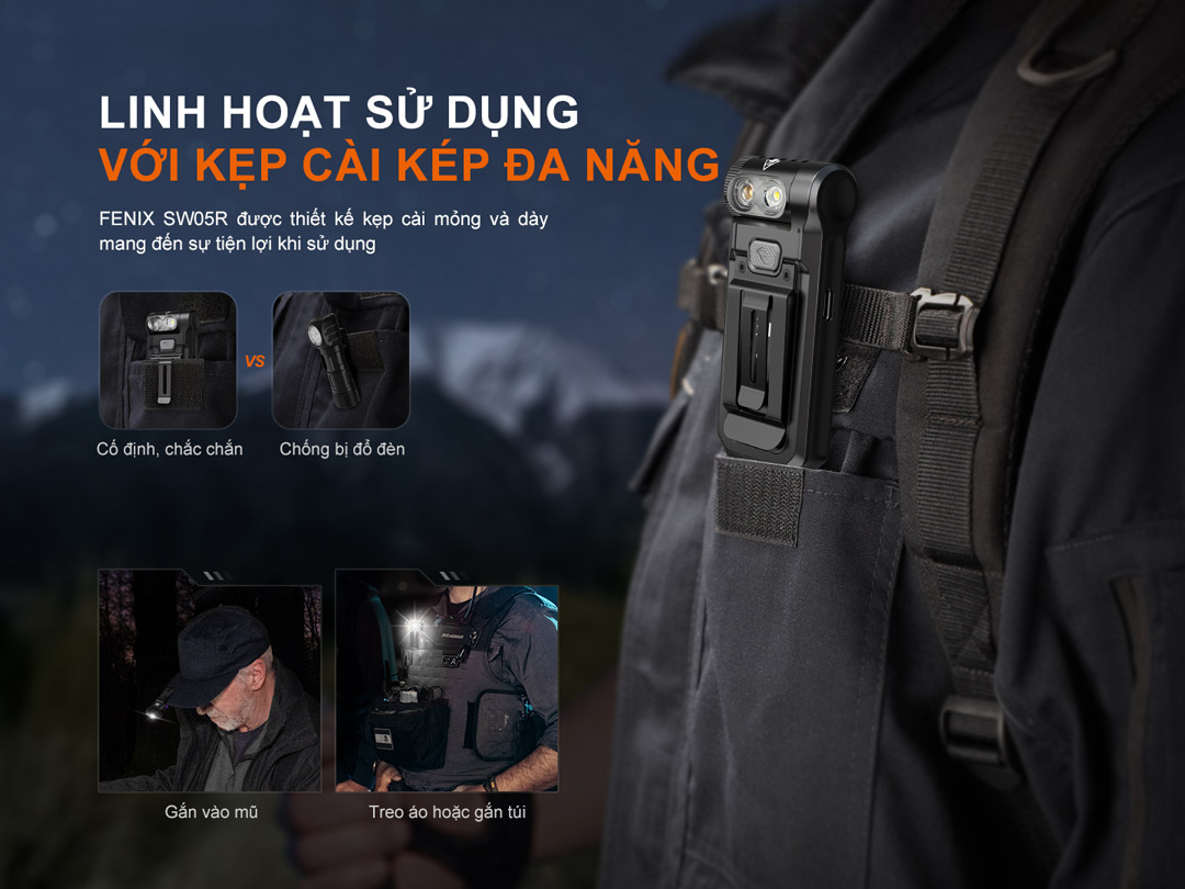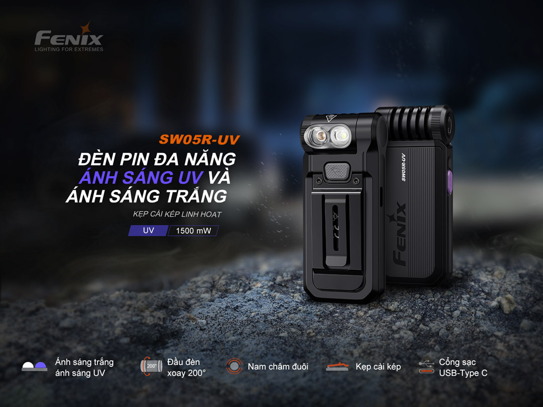 Fenix SW05R – đèn pin đa năng nhỏ gọn, trọng lượng siêu nhẹ 55g (bao gồm pin), độ sáng 150 lumen, chiếu xa 39m. Sử dụng pin liền thân 700mAh, sạc qua cổng USB-C. Đèn có chế độ ánh sáng trắng và UV (365nm, 1500mW). Trang bị kẹp cài kép chắc chắn để gắn túi, ba lô, viền mũ, cùng nam châm ở đuôi giúp gắn lên bề mặt kim loại. Đầu đèn xoay 200°, tăng tính linh hoạt. Phù hợp cho cảnh sát, chuyên viên, EDC nhờ thiết kế nhỏ gọn, dễ mang theo.