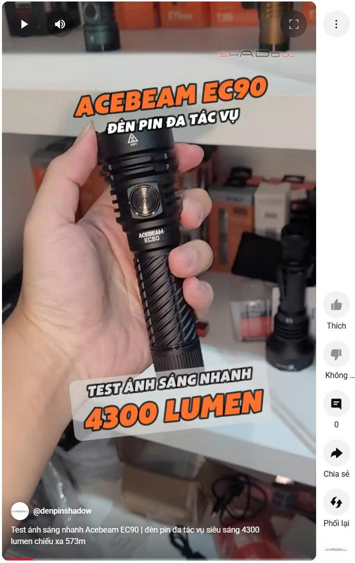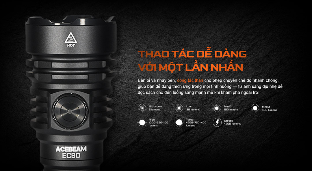 Acebeam EC90 là đèn pin EDC chiếu xa thế hệ mới, mang lại độ sáng cực mạnh 4300 lumen và tầm chiếu 573 mét từ một LED LUMINUS SFT-90X. Công tắc kim loại bền bỉ cho phép chuyển mức sáng nhanh chóng; đuôi nam châm bám chắc bề mặt kim loại để bạn làm việc rảnh tay.