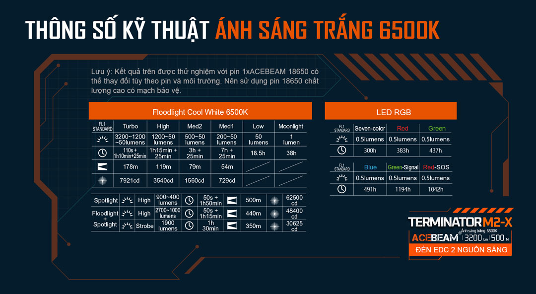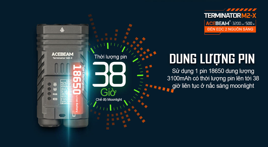 Acebeam Terminator M2-X là mẫu đèn pin mini cao cấp mới ra mắt của ACEBEAM sử dụng 2 nguồn sáng giúp đáp ứng các yêu cầu về chiếu gom, chiếu tỏa.đèn có chế độ LED RGB đẹp mắt, chế độ SOS, nháy.. Sử dụng 1 pin 18650 USB-C. ACEBEAM M2-X phù hợp hầu các hoạt động dân dụng hàng ngày như đi biển, dã ngoại, cắm trại.. Đèn cũng là một phiên bản cải tiến từ huyền thoại đèn pin cao cấp Acebeam M1 với kích thước nhỏ gọn hơn, đa năng hơn