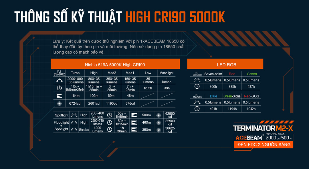 - LED Nichia 5000K CRI90 + 1 LED chiếu xa + 1 LED RGB