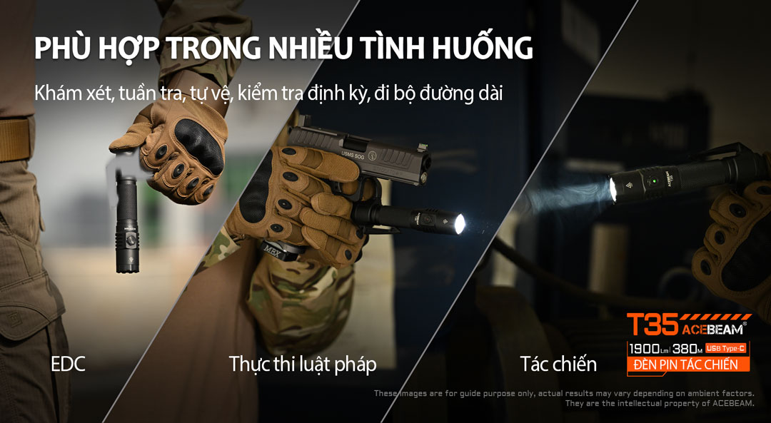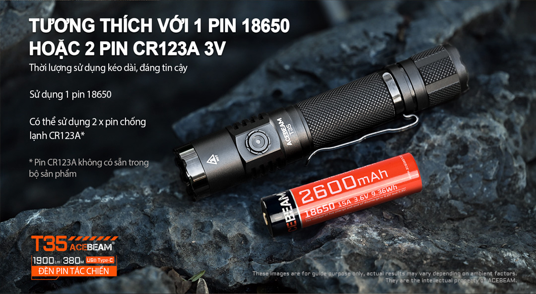 ACEBEAM T35 là mẫu đèn pin mini tác chiến sử dụng 1 LED Luminus SFT40 với 2 phiên bản nhiệt màu 6500K độ sáng 1900 lumen tầm chiếu xa 380m và 5000K độ sáng 1600 lumen, tầm chiếu xa 352m. Đèn sử dụng 1 viên pin 18650 dung lượng 2600mAh có thời lượng pin lên tới 400 giờ ở nấc sáng thấp nhất hoặc 2 pin CR123A. T35 có kích thước đèn nhỏ gọn, vừa tay, nguồn sáng mạnh mẽ phù hợp cho các hoạt động t-á-c c- h-i-ế-n, tuần tra, hoạt động chuyên dụng và các hoạt động dân dụng hàng ngày như đi biển, dã ngoại, cắm trại...