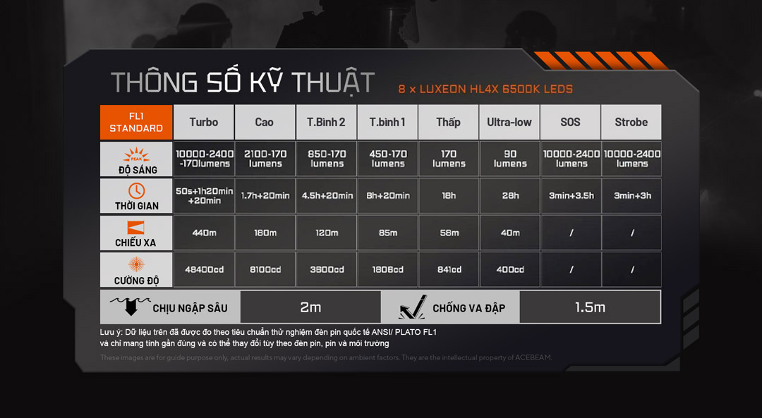 Đèn pin ACEBEAM IP68 chống nước, đèn pin chịu va đập 1.5m, đèn pin bền bỉ dùng trong mưa và môi trường khắc nghiệt.