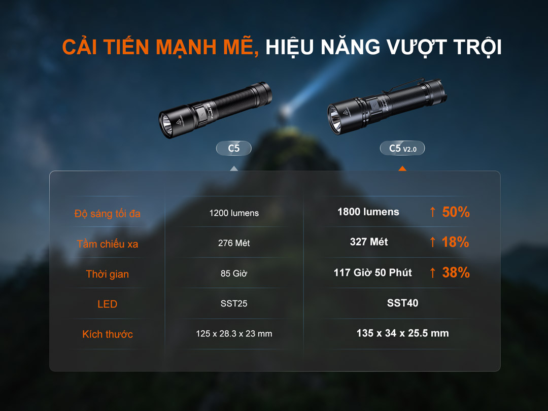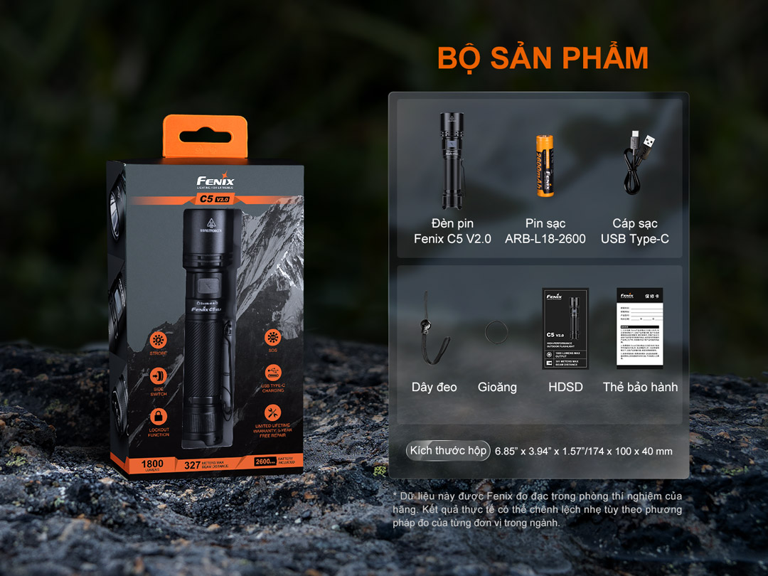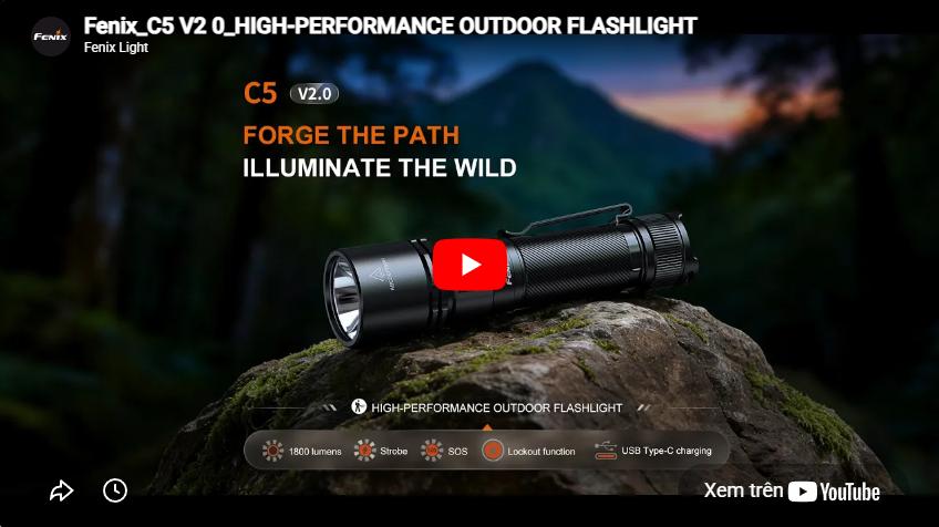 Đèn pin hiệu suất cao Fenix C5 V2.0. Có độ sáng 1800 lumen, tầm chiếu xa 327m, sử dụng LED Luminus SST40, đi kèm pin sạc 18650 và hỗ trợ sạc USB Type-C trên thân, nổi bật với 5 mức sáng kèm Strobe và SOS, thời lượng sử dụng lên tới 117 giờ, thân đèn làm bằng nhôm A6061-T6 HAIII, đuôi nam châm, phù hợp cho bảo trì công nghiệp, kỹ thuật, làm việc ngoài trời và nhiều tình huống
