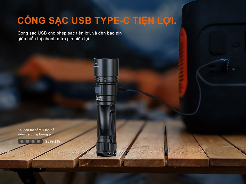 | Cổng sạc | Sạc USB-C trên thân đèn |