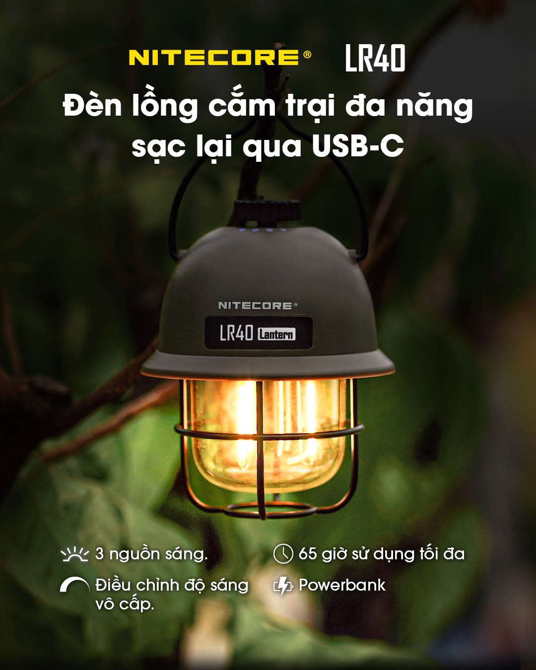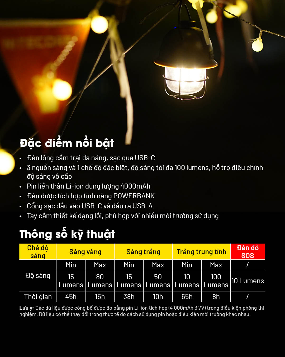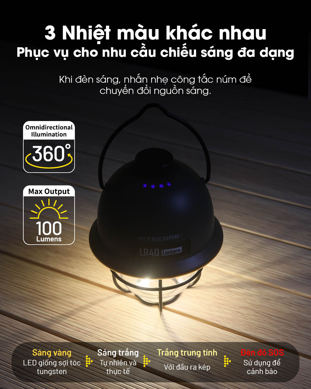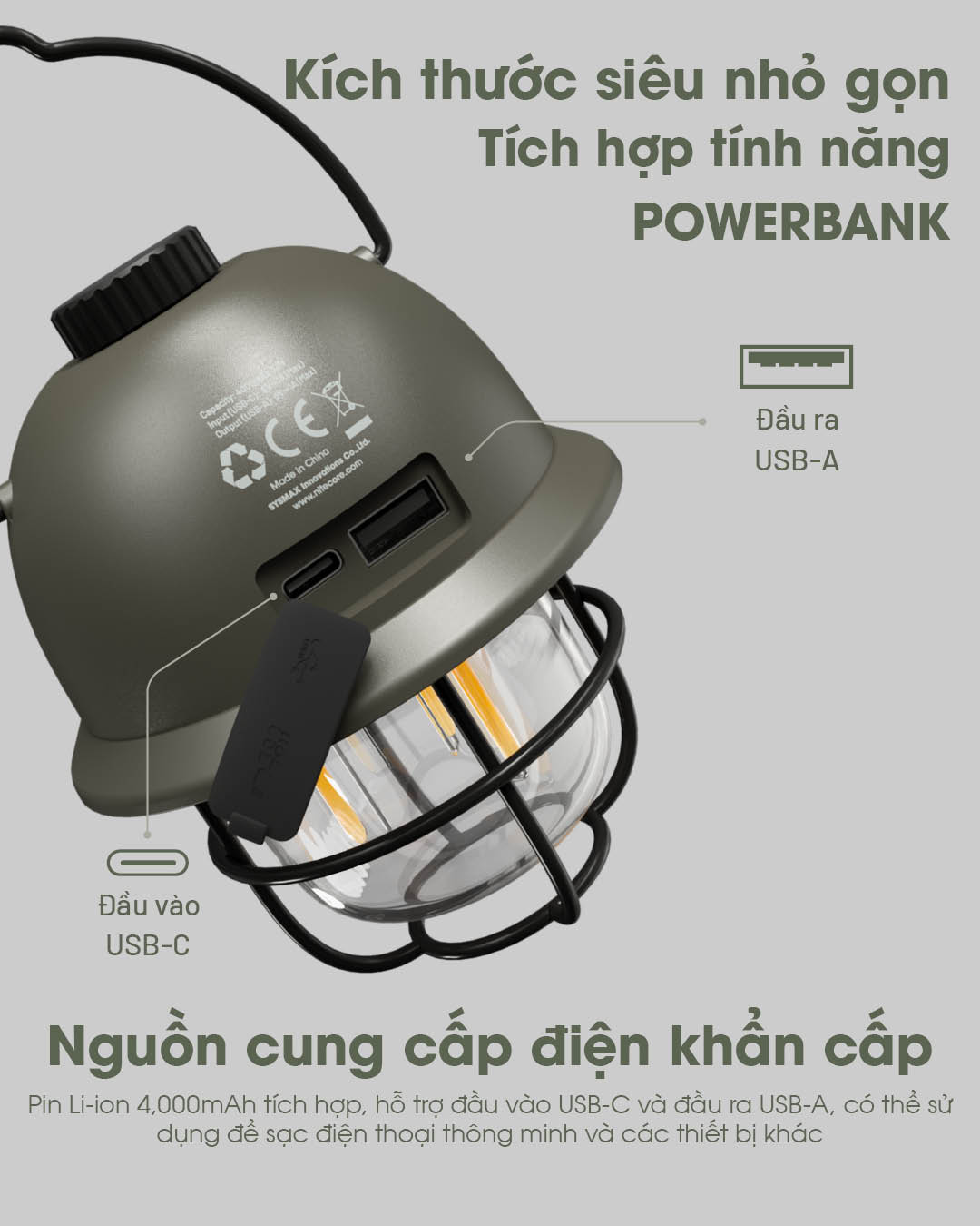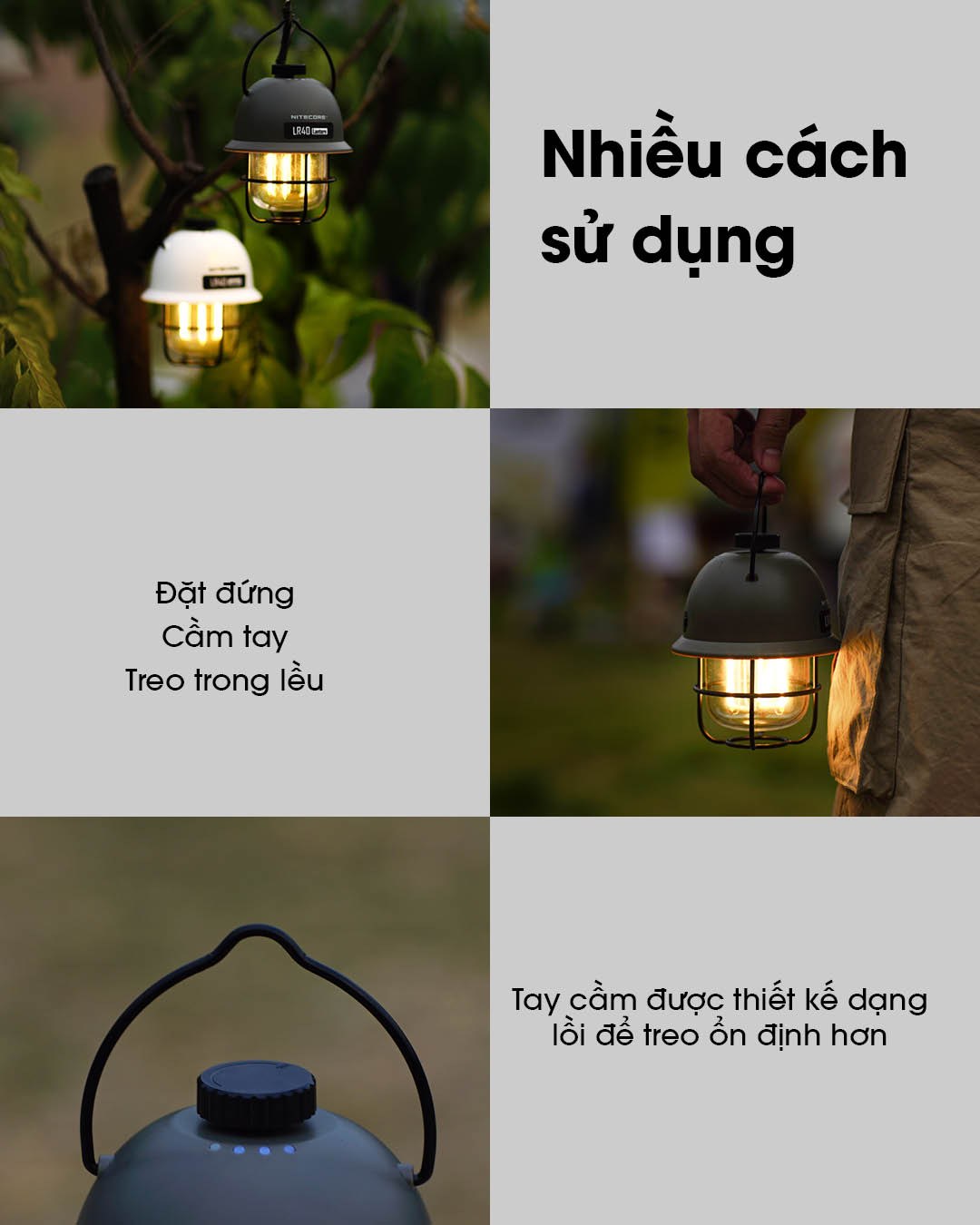 Sở hữu thiết kế đèn theo kiểu cổ điển mà vẫn giữ được sự trang trọng, có thể sử dụng làm đèn cắm trại hoặc trang trí. Sử dụng LED giống như dây tóc vonfram cho độ sáng đèn lên tới 100 lumens với 3 nguồn sáng cho chùm sáng toả 360°, 3 nhiệt màu chính (có thể điều chỉnh nấc sáng vô cấp) và ánh sáng đỏ đa dụng trong nhiều trường hợp, thời lượng pin của đèn lên tới 4000mAh cho thời gian sử dụng lên tới 65 giờ chỉ qua 1 lần sạc, đèn cũng tích hợp thêm các tính năng như powerbank( sạc ngược lại cho các thiết bị khác), móc treo đèn cũng được làm lồi lên để treo đèn ổn định hơn, đèn phù hợp với các hoạt động cắm trại, dã ngoại...vv