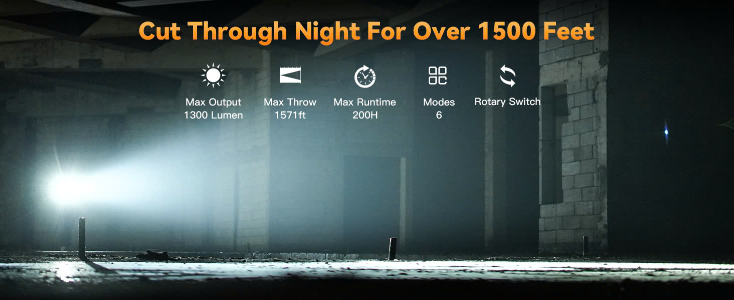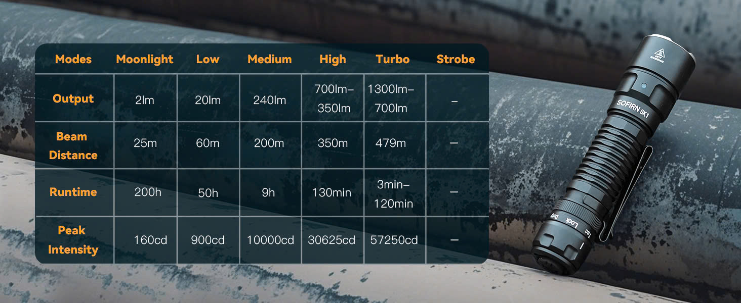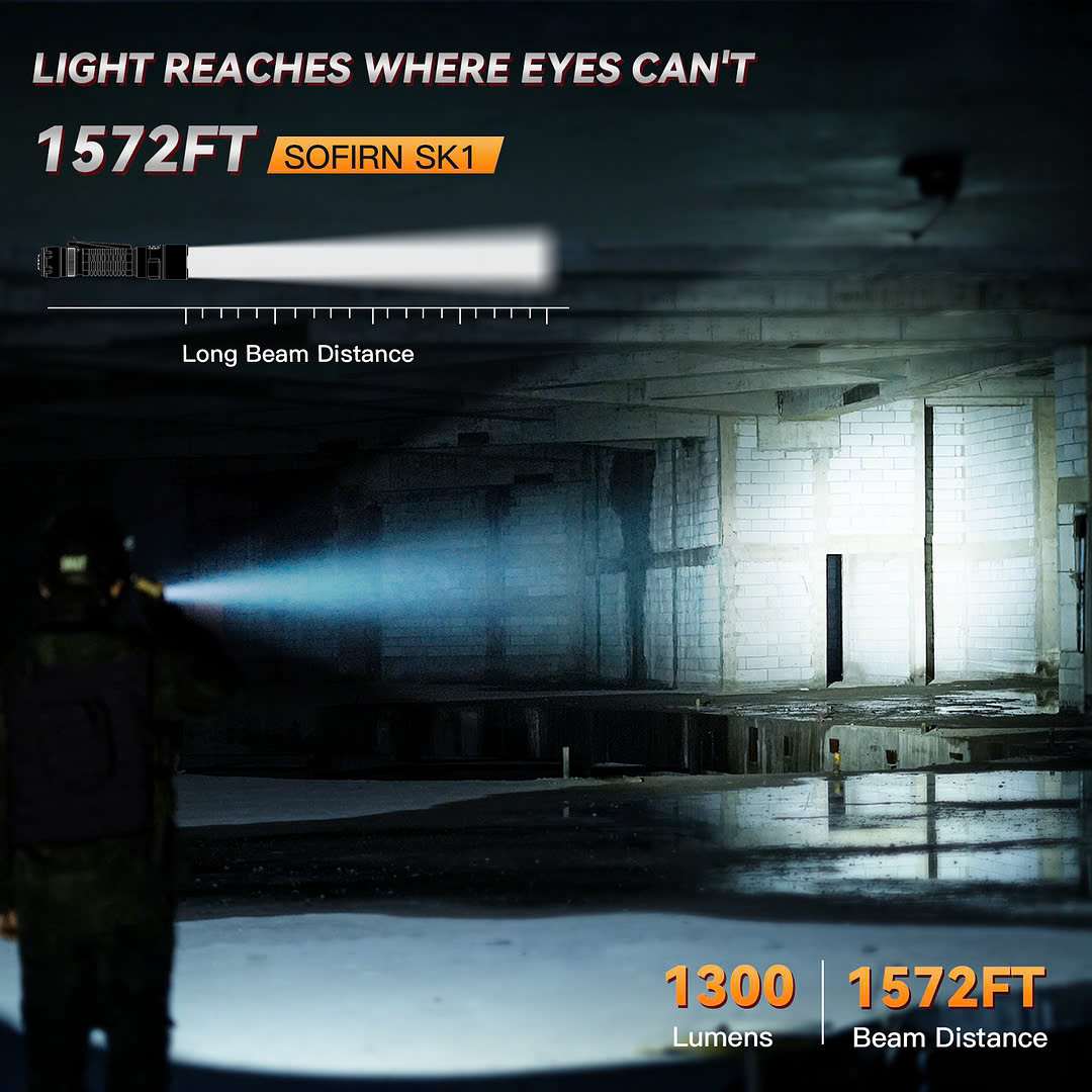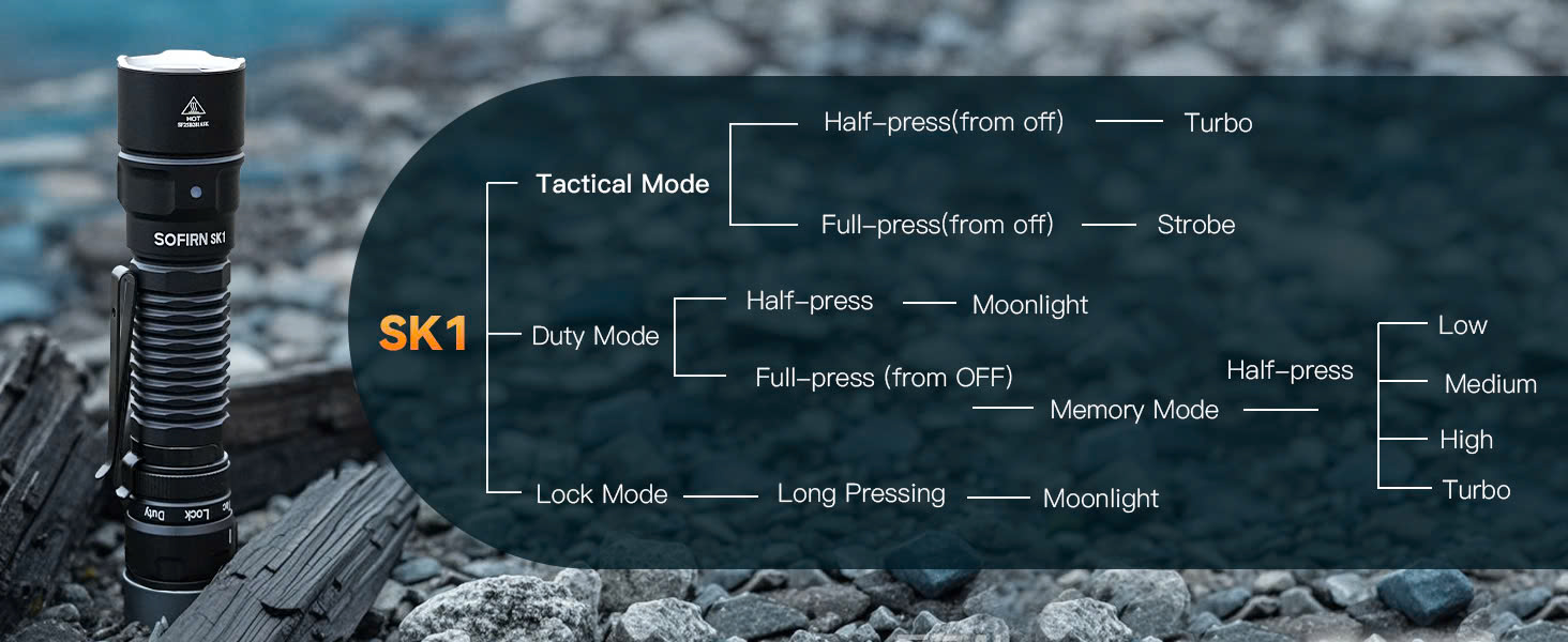 Đèn pin chiến thuật SOFIRN SK1 - siêu sáng 1300 lumen, chiếu xa tới 479m, là trợ thủ đắc lực cho mọi tình huống. Sử dụng hệcông tắc xoay và công tắc đuôi 2 tầng, linh hoạt thay đổi chế độ (Dân dụng, Chiến Thuật, Khóa) và mức sáng (có cả Moonlight và Strobe). Sử dụng pin 18650, cổng sạc USB- C trên thân, thân đèn lằm bằng nhôm siêu bền, chống nước IP68, hoạt động tốt bất chấp thời tiết.phù hợp cho các hoạt động EDC, đi phượt, cắm trại hay tự vệ.vv