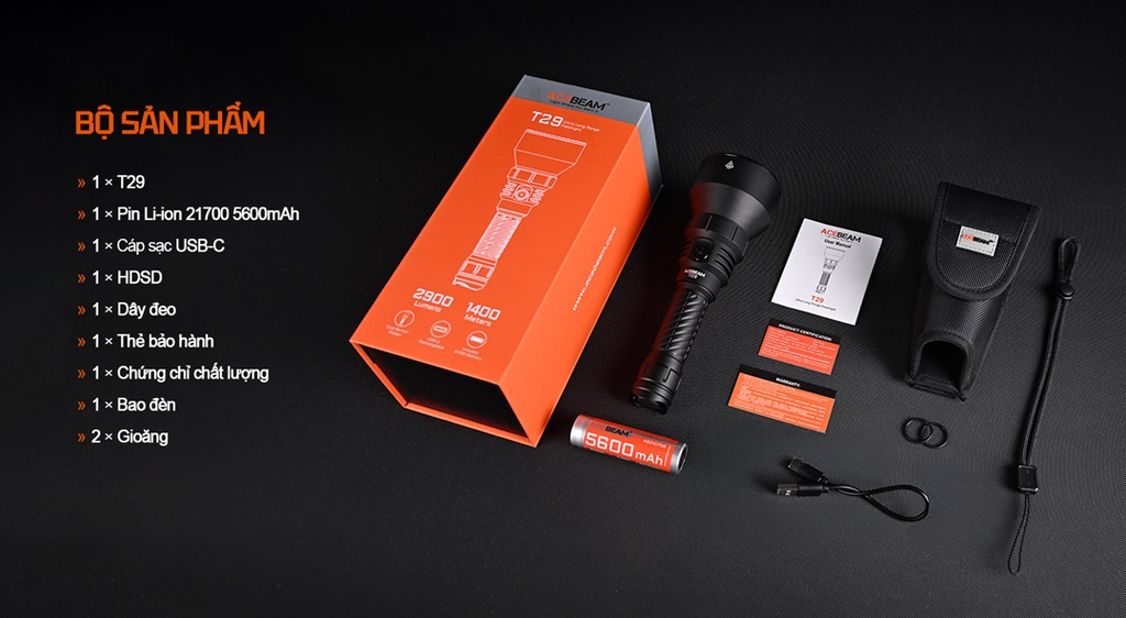 Bộ phụ kiện ACEBEAM T29 đầy đủ – Pin 21700 5600 mAh | Bao đèn | Cáp sạc USB-C
