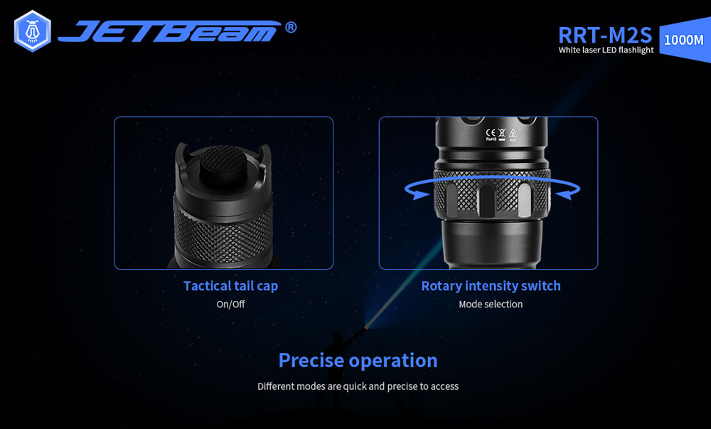 JETBeam RRT-M2S - Đèn pin chiếu xa Laser trắng LEP, là đèn pin laser được thiết kế với độ sáng 480 lumen, tầm chiếu xa lên tới 1000 mét. Với tầm chiếu xa ấn tượng này, đèn tầm chiếu xa rất phù hợp cho những người đi s-ăn thú đêm hay các hoạt động khác như cắm trại, tìm kiếm và cứu hộ, chỉ huy công trường hoặc bất kỳ hoạt động ngoài trời nào. Với công suất chiếu sáng đạt 480lumen RRT-M2S đã có thể đạt đến tầm chiếu xa 1000m thay vì phải đẩy công suất lên đến hơn 1200 Lumens như những cây đèn khác. Đèn được trang bị pin 21700 dung lượng cao 5100mAh, như vậy thời gian sử dụng đèn có thể lên tới 11.5 tiếng. Ngoài ra, các thao tác điều khiển rất linh hoạt, thuận tiện và dễ dùng khi người sử dụng chỉ cần vặn công tắc xoay để thay đổi các chế độ sáng.