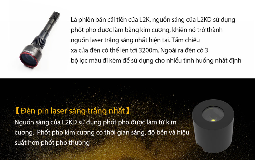 Đèn laser MAXTOCH L2KD là một trong những cây đèn pin chiếu xa nhất thế giới áp dụng công nghệ LEP với tầm chiếu xa đạt 3.200m và độ sáng tối đa là 650 lumen. Đèn sử dụng bộ 2 pin Li-ion 21700 5000 mAh tích hợp, thời gian chiếu sáng có thể lên tới 9 giờ 10 phút ở mức sáng thấp nhất. Với tầm chiếu cực xa, đèn laser L2KD thích hợp trong việc s-ăn b-ắn, hả-i quâ-n, b-iên p-hòng, qu-ân s-ự,...