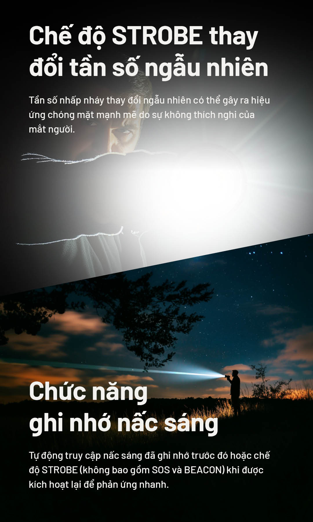 Khi đèn sáng, nhấn giữ nút chế độ để chuyển qua STROBE – BEACON – SOS, thả tay để chọn.