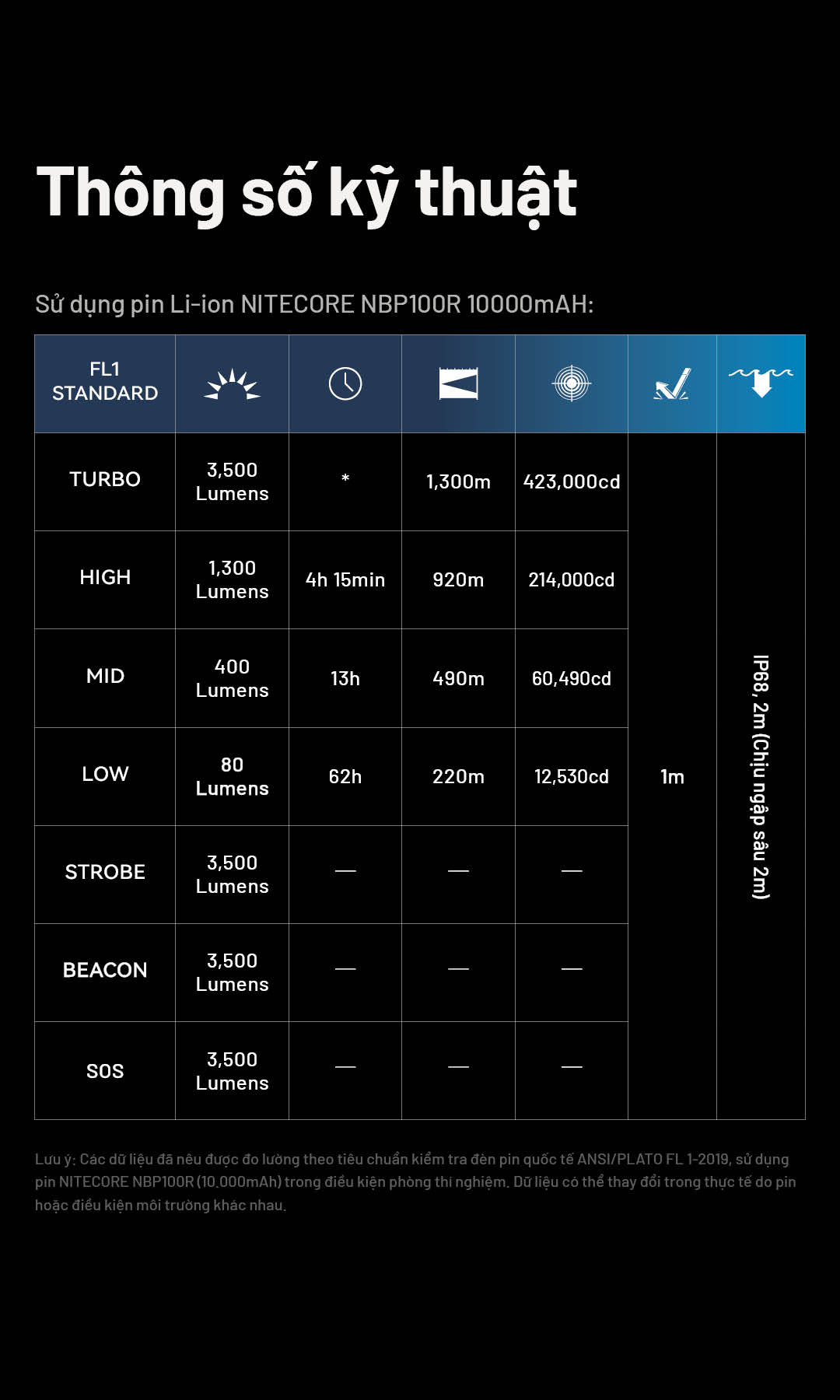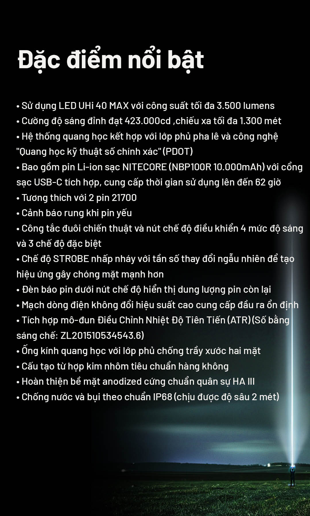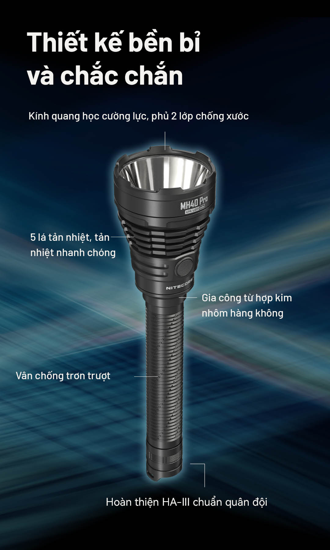 | Vật liệu | Thân đèn làm từ hợp kim nhôm hàng không, hoàn thiện anodized cấp quân sự HA III. |