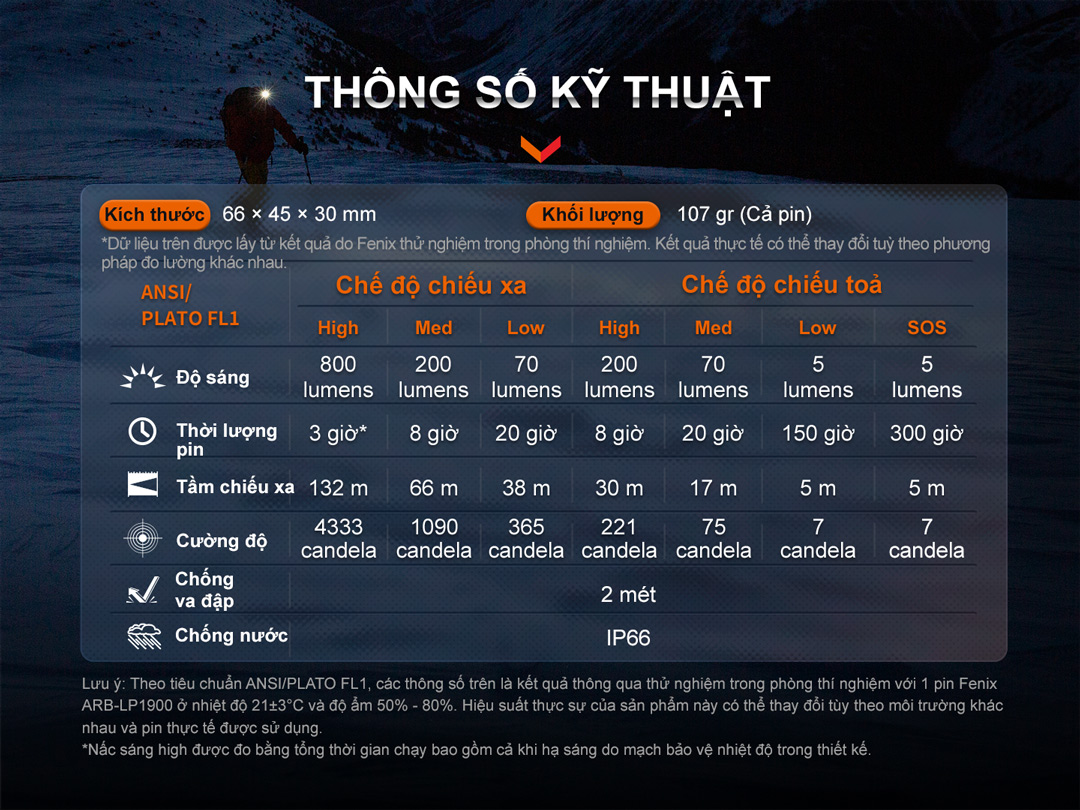 | Kích thước | 66mm (Chiều dài ) x 45mm (Chiều cao) x 30mm (Đường kính đầu đèn) |