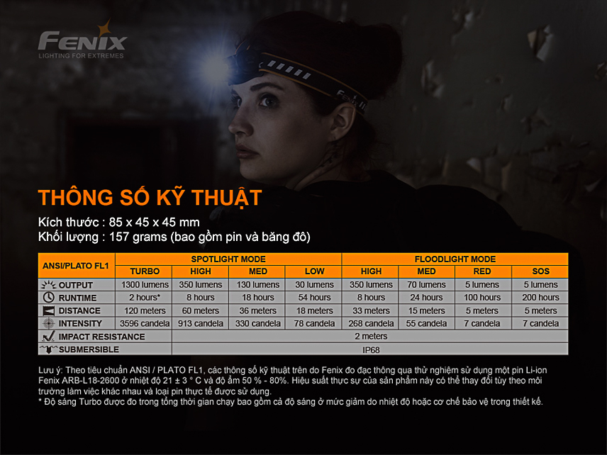 Fenix HM60R với hai bóng đèn có tổng độ sáng tối đa 1300 lumen giúp tầm chiếu xa lên tới 120m (theo tiêu chuẩn quốc tế về đèn pin (ANSI PLATO FL1).