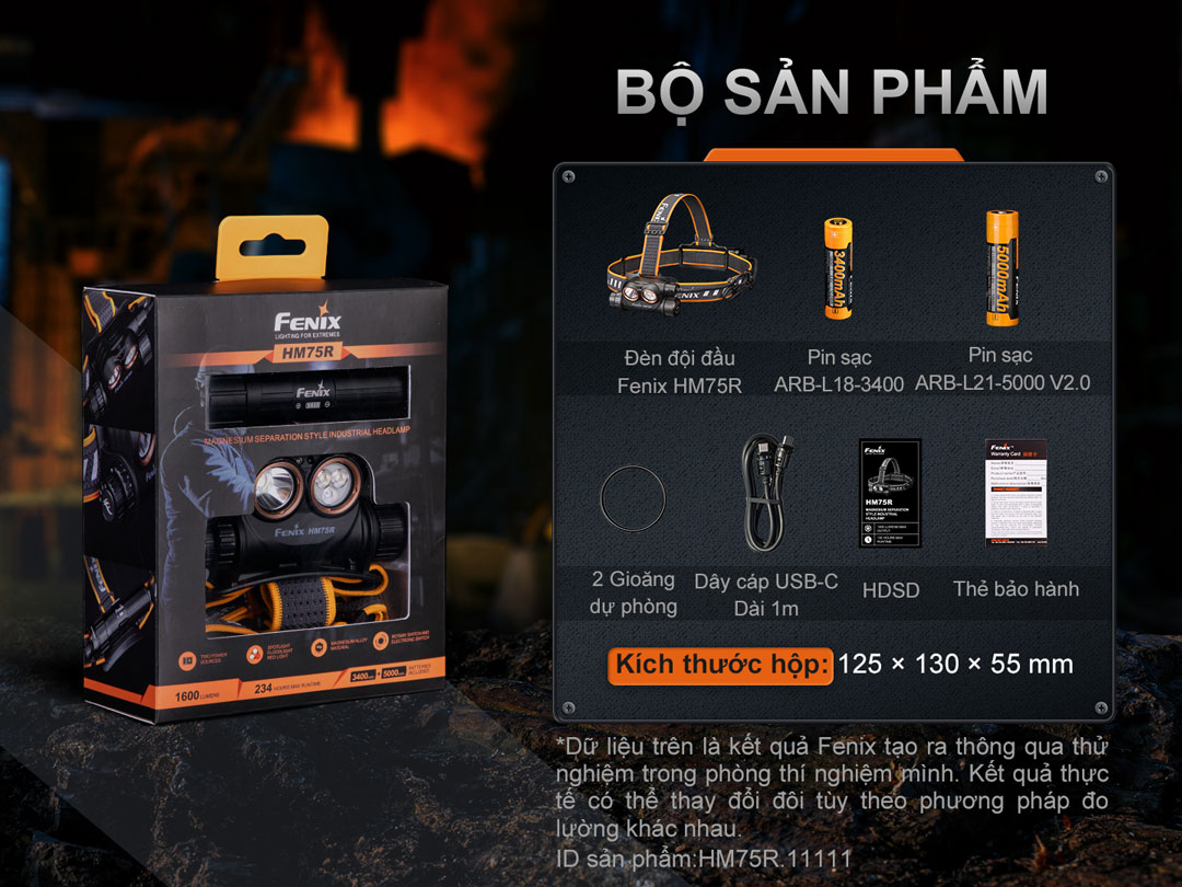 Đèn pin đội đầu Fenix HM75R là mẫu đèn công suất cao với chùm sáng mạnh, trang bị 1 LED SST40 ánh sáng trắng, 2 LED SST20 ánh sáng trắng trung tính, và 1 LED OSRAM GR QSSPA1.23 ánh sáng đỏ. Đèn có tổng độ sáng lên tới 1600 lumen, tầm chiếu xa 223m. Điểm đặc biệt của đèn là có trang bị kèm thêm 1 pack pin dự phòng 21700 ở phía sau, vốn trên thân đèn cũng có 1 pin 18650 3400mAh nâng tổng thời lượng pin lên tới 18 tiếng 55 phút ở nấc sáng 350 lumens (đây là thông số mà hiếm đền đội đầu nào đạt được), biến HM75R trở thành 1 sự lựa chọn hoàn hảo cho các hoạt động chuyên dụng trong hầm mỏ, khu công nghiệp, ....