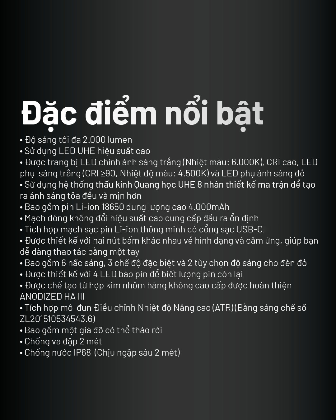 - Độ sáng lên tới 2.000 lumen và 222m