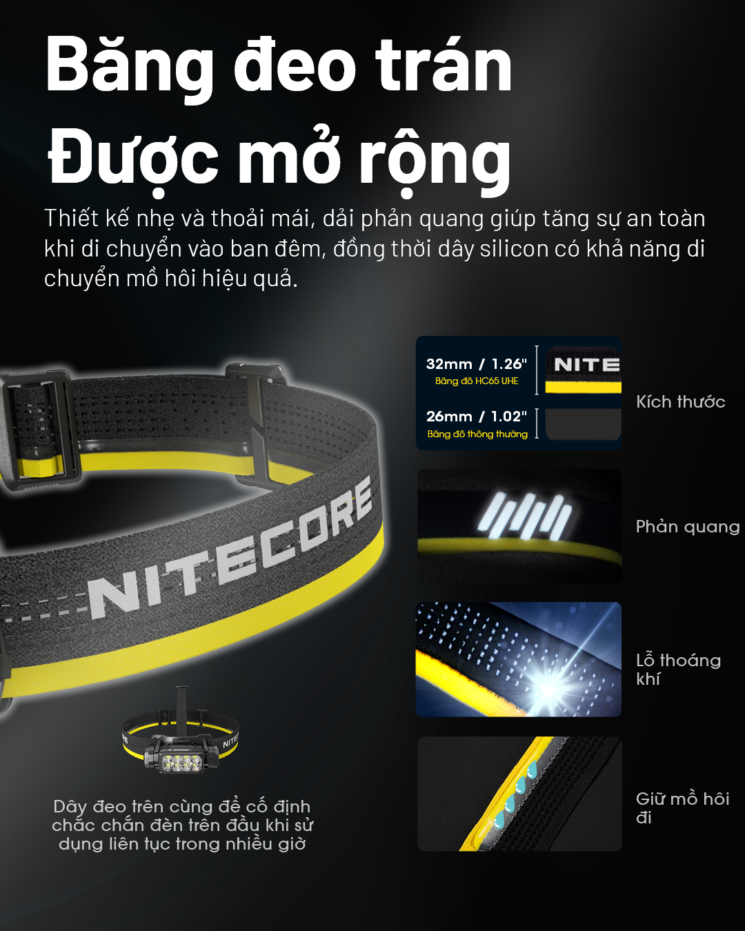 - Băng đeo đầu có phản quang co giãn và khả năng thoát mồ hôi tốt.