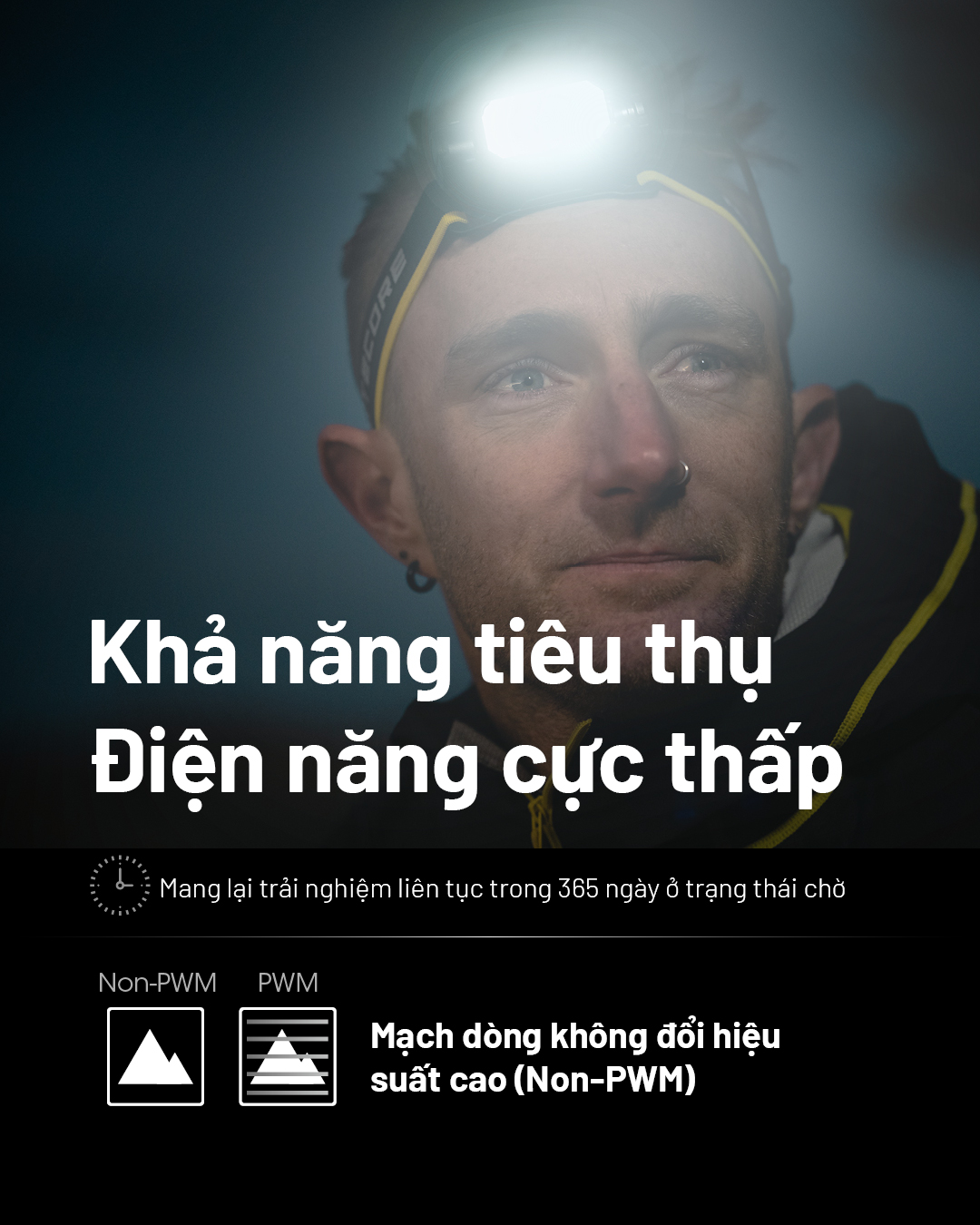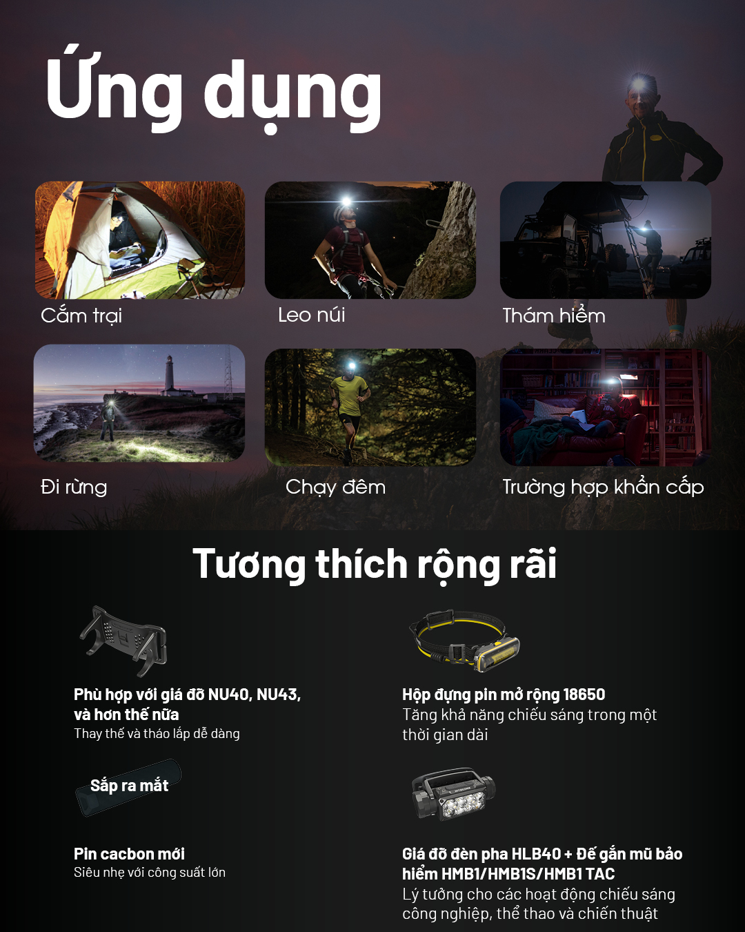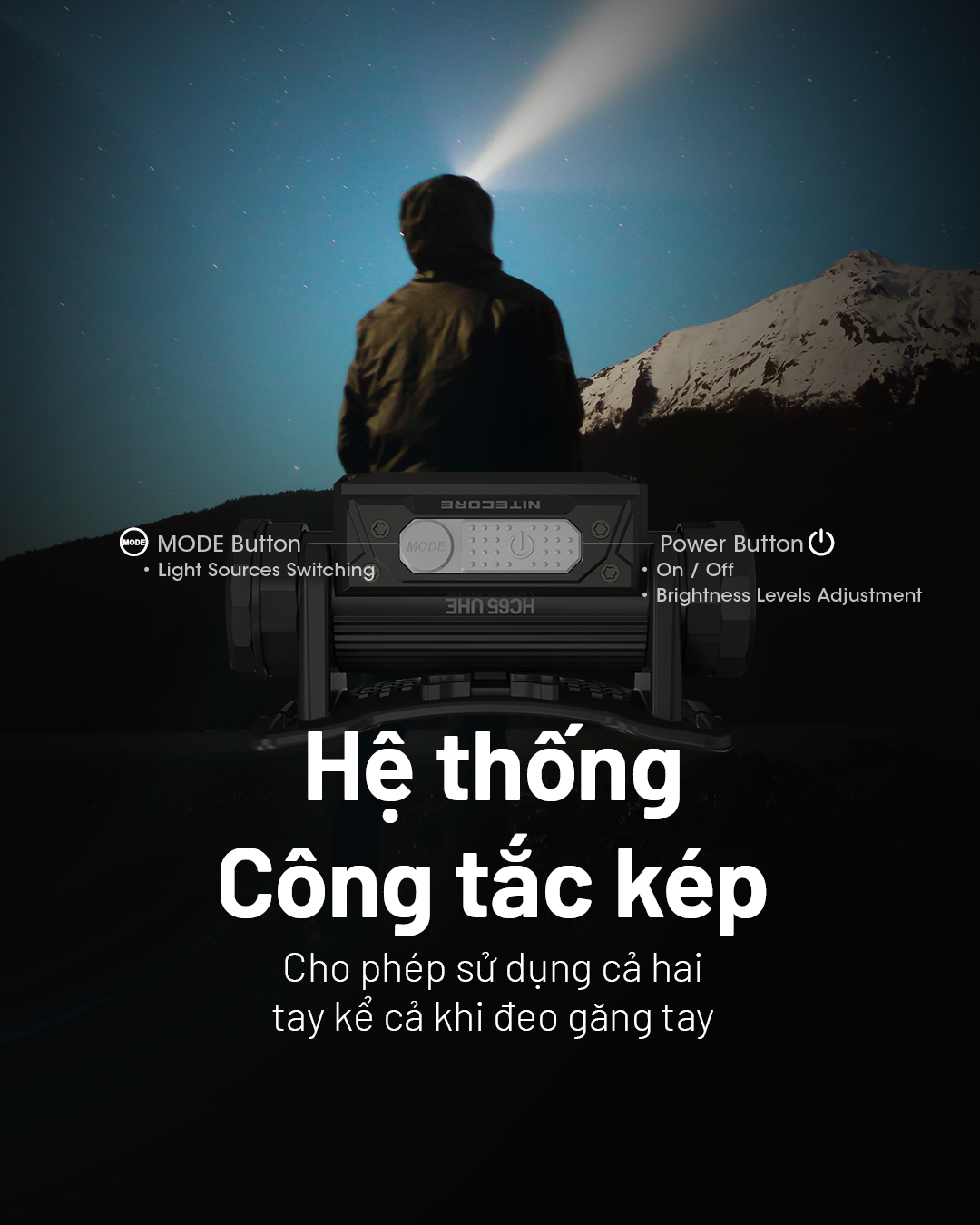 - NITECORE HC65 UHE sử dụng thấu kính quang học cùng 8 LED UHE do chính Nitecore tự phát triển với diện tích nhân LED tăng, hiệu suất ánh sáng/điện năng tiêu thụ tăng 21% nếu so với LED SST40