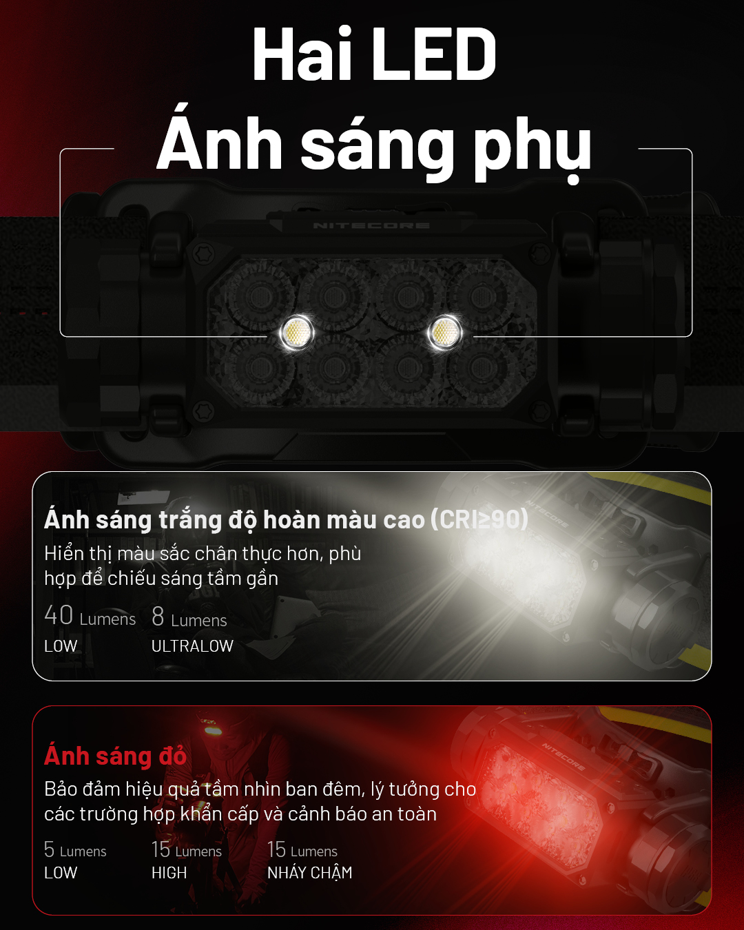 - Có chế độ ánh sáng đỏ và ánh sáng phụ CRI90 tầm gần