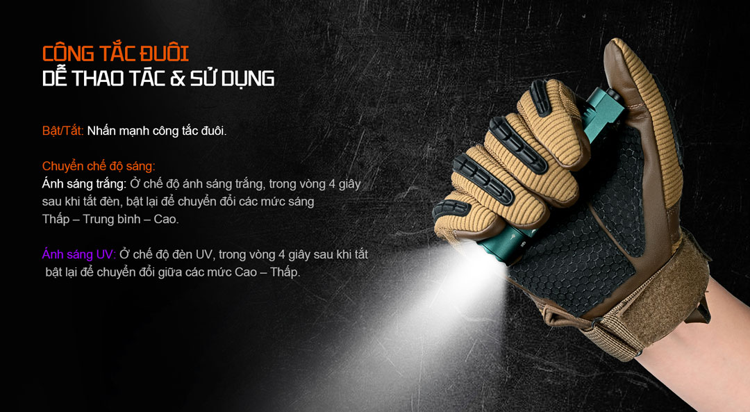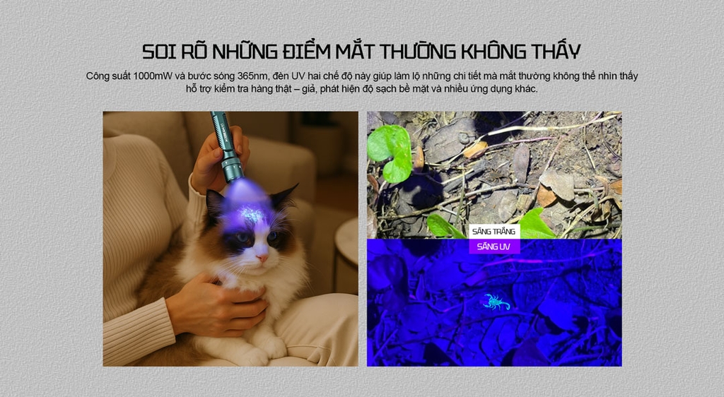 EDC hằng ngày, dã ngoại/cắm trại, sửa chữa gần, kiểm tra bề mặt – soi UV (dấu bảo mật, chất lỏng, vết bẩn), định hướng bằng Green Beam trong môi trường tối.