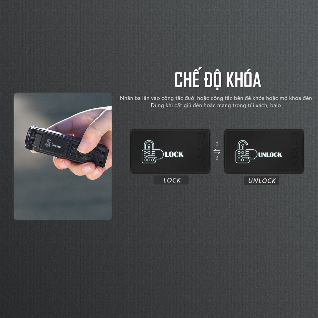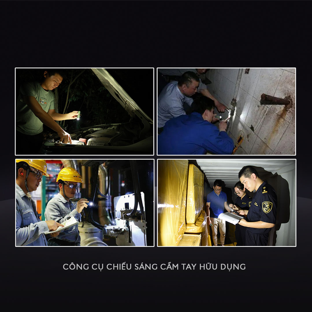 - Thiết kế rất gọn gàng, dễ dàng bỏ túi, nhỏ bé nhưng lại có chùm sáng mạnh mẽ và thêm 1 nguồn sáng phụ đa năng