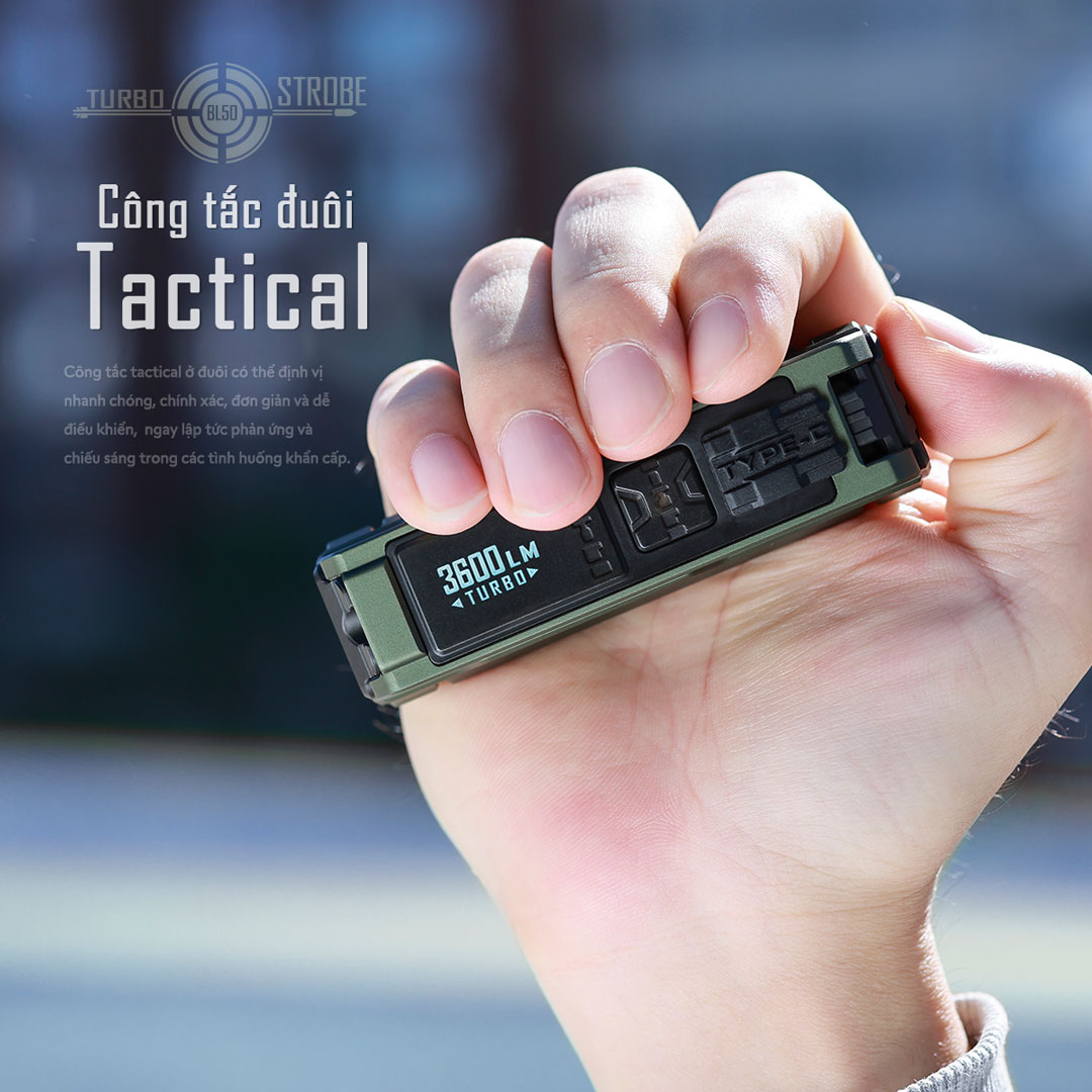 Đèn pin EDC IMALENT BL50 là mẫu đèn pin mini siêu sáng, sử dụng 2 nguồn sáng 1 LED CREE XHP50.3 Hi với độ sáng 3600 lumens chiếu xa 428m và 1 LED tia UV với bước sóng 365nm. BL50 sử dụng màn OLED giúp hiển thị trạng thái của đèn chính xác của pin, cùng công tắc đuôi hỗ trợ người dùng trong các hoạt động sử dụng ngoài trời, cắm trại,.... Tia UV có thể soi tiền giả, giấy tờ,... Ngoài ra đèn còn có 4 phối màu tha hồ lựa chọn bao gồm: đen, xanh lá, xanh nước biển, xám.