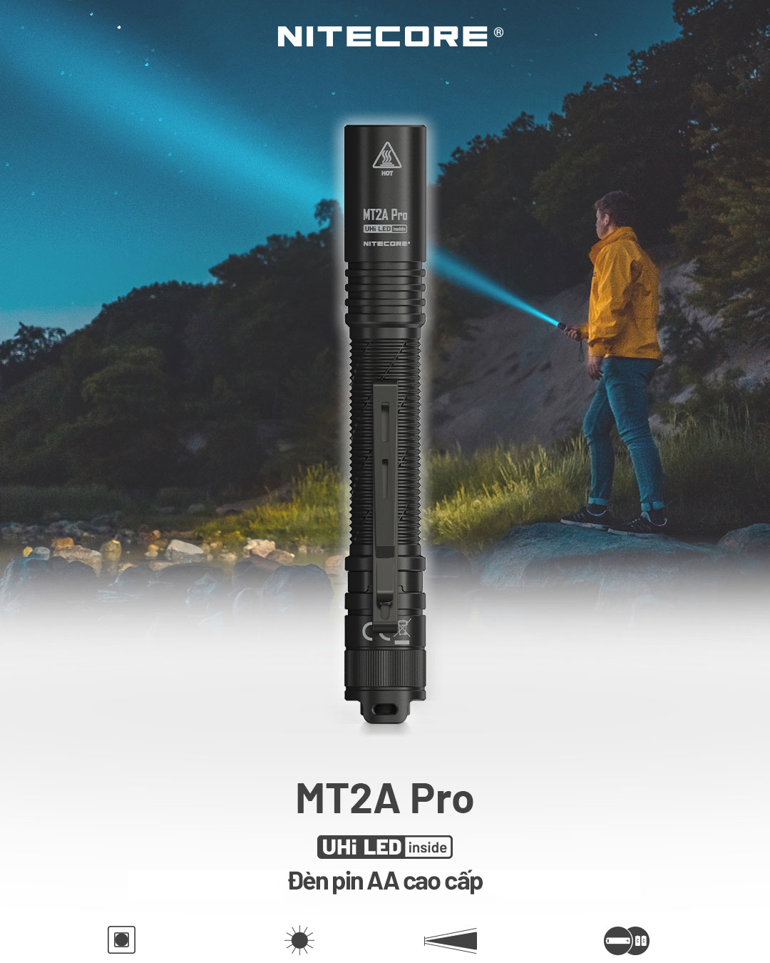 NITECORE MT2A Pro là cây đèn pin EDC sử dụng LED UHi 20 Max - 1 dòng LED mới hãng NITECORE phát triển riêng nhằm tối đa hóa cường độ sáng. Đèn có độ sáng 1000 lumen và tầm chiếu xa 255m với đầu đèn kích thước siêu nhỏ chỉ 19.7mm. Sử dụng 1 pin NL1416R 1600mAh tích hợp cổng sạc USB-C trên đầu pin hoặc 2 pin AA. Đèn có 1 công tắc đuôi giúp điều chỉnh bật/tắt, thay đổi độ sáng, biến MT2A pro phù hợp với các hoạt động mang theo hàng ngày, sửa chữa kỹ thuật, cắm trại, dã ngoại,...