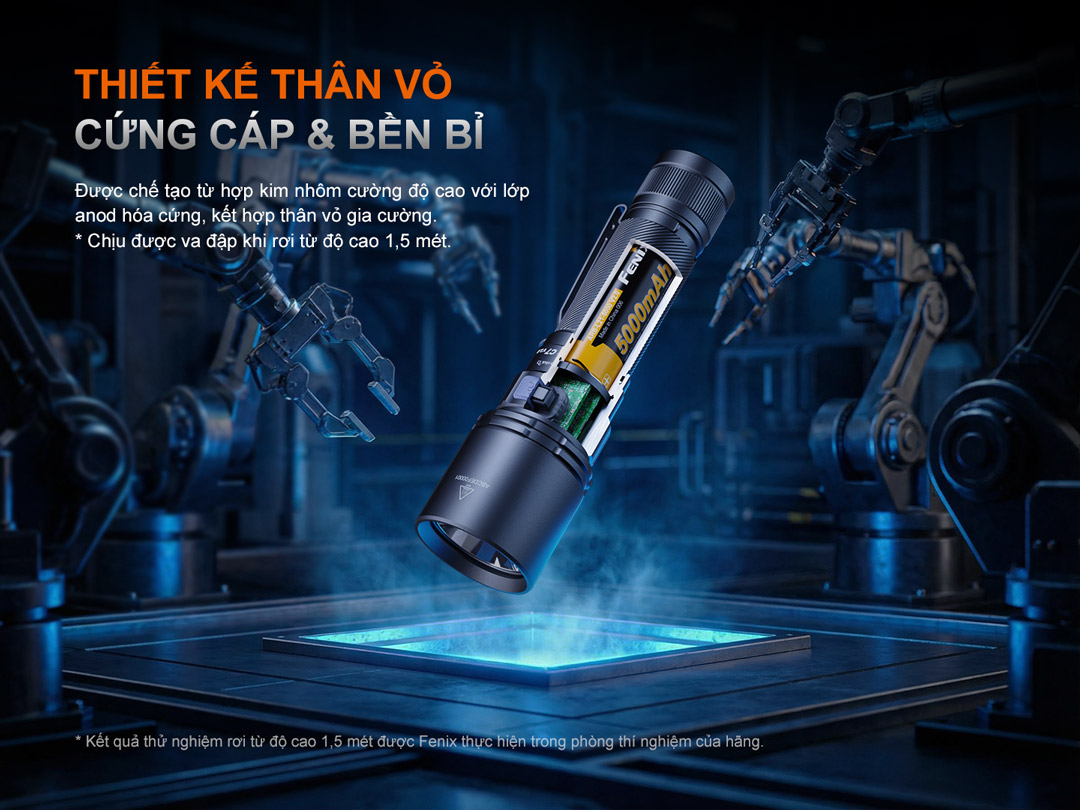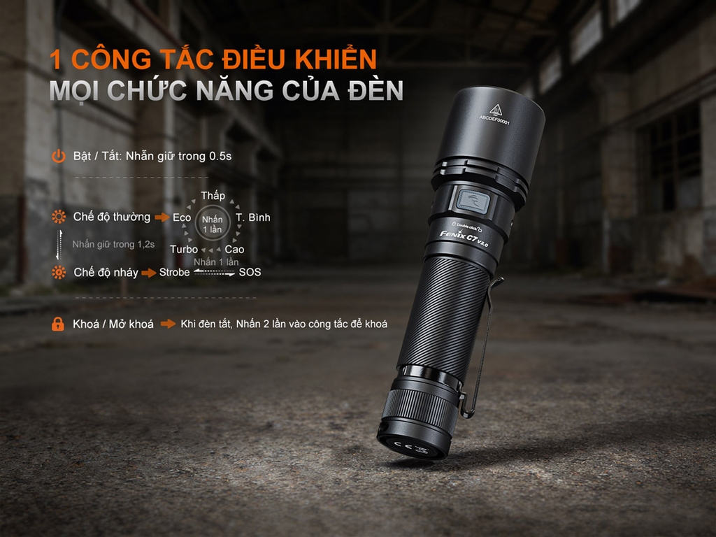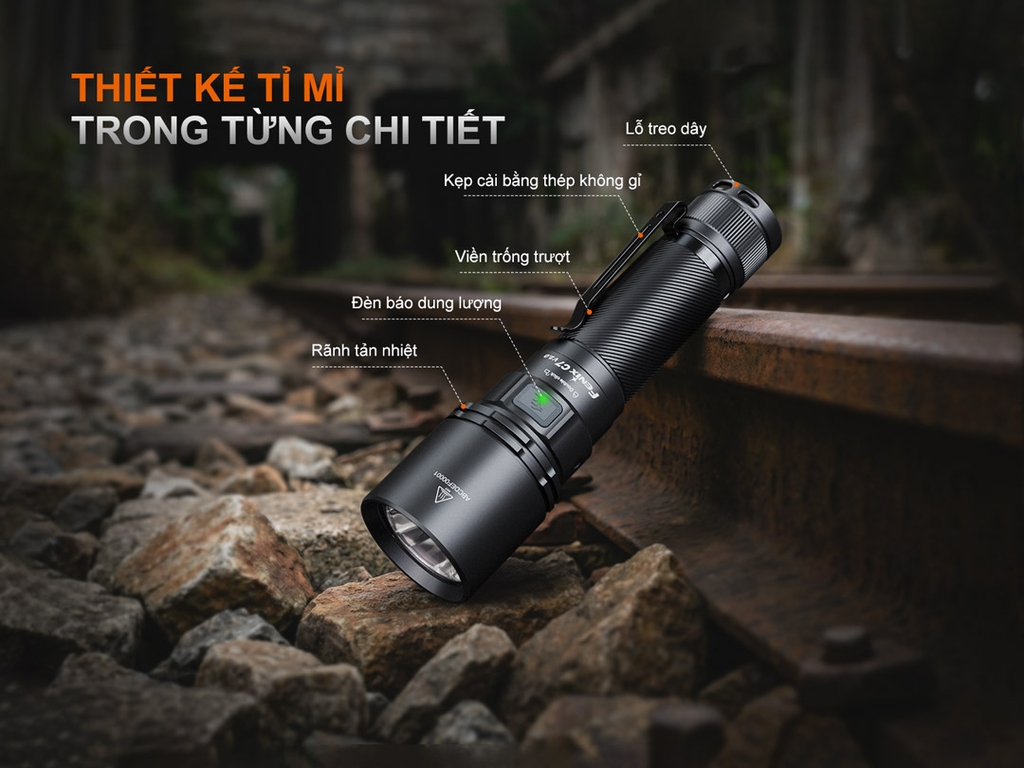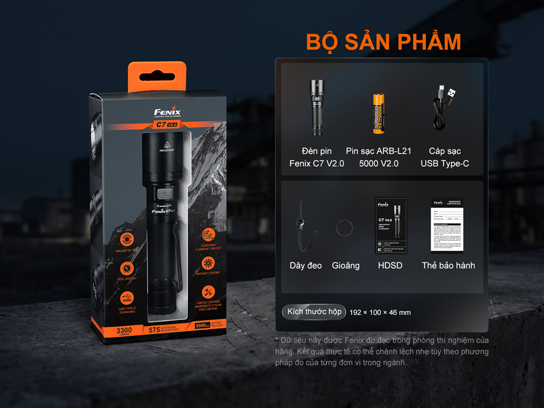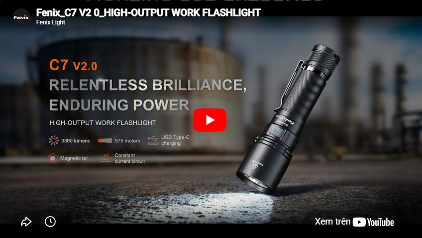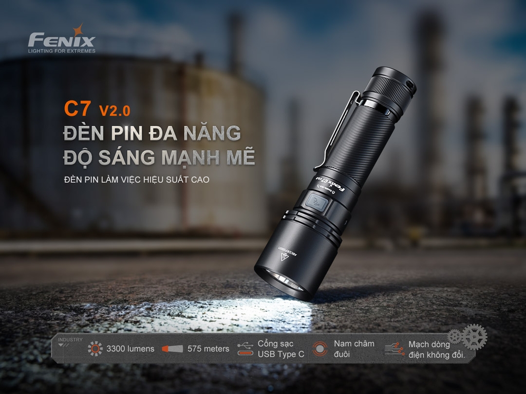đèn pin chiếu xa Fenix C7 V2.0 là mẫu chiếu xa hiệu suất cao. Độ sáng 3300 lumen, chiếu xa 575m, sử dụng LED Luminus SFT70 Gen2 cho chùm sáng trắng mạnh, gom sáng tốt, sử dụng 1 pin sạc 21700 5000mAh. Thân đèn làm bằng nhôm A6061-T6 bền bỉ & chắc chắn, chống nước IP68, đuôi nam châm, clip cài thép không gỉ, phù hợp cho công việc kỹ thuật, tuần tra, kiểm tra khu vực rộng, tìm kiếm ngoài trời và dã ngoại.