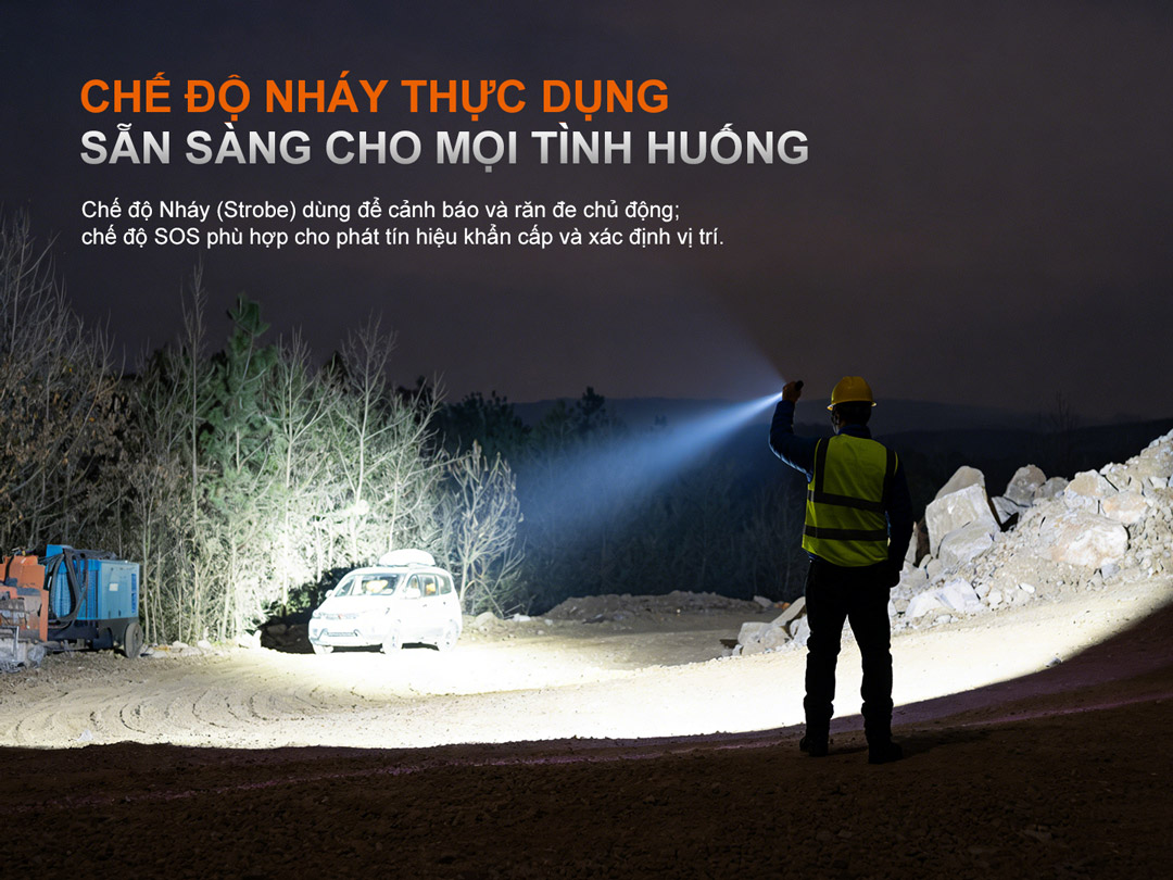 Nhấn giữ công tắc khoảng 1,2 giây để vào Strobe, sau đó bấm 1 lần để chuyển giữa Strobe và SOS.