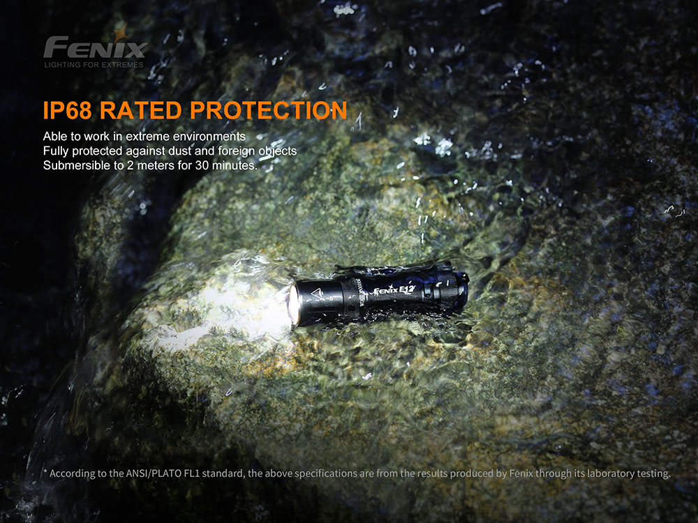 Đèn pin mini FENIX E12 V2 với độ sáng tối đa đạt 160 lumen, đèn sử dụng thấu kính cường lực quang học siêu mỏng, mang lại chùm sáng mềm, cân bằng và chỗ trợ tầm chiếu xa lên tới 68m. Đèn pin Fenix E12 V2 có 3 nấc sáng cố định, điều khiển bởi công công tắc đuôi. Đèn pin mini cầm tay, kèm với clip gài 2 chiều giúp người dùng có thể dễ dàng kẹp vào áo, mũ lưỡi trai, balo cũng như bỏ túi mang theo hàng ngày. Đạt tiêu chuẩn chống bụi và chống nước IP68, đèn dễ dàng hoạt động dưới mọi loại thời tiết mưa gió. Được đánh giá là siêu nhỏ và siêu sáng, Fenix E12 V2.0 là một phiên bản đèn EDC tuyệt vời cho các hoạt động ngoài trời như cắm trại, dã ngoại, sửa chữa, bảo trì, EDC, ...