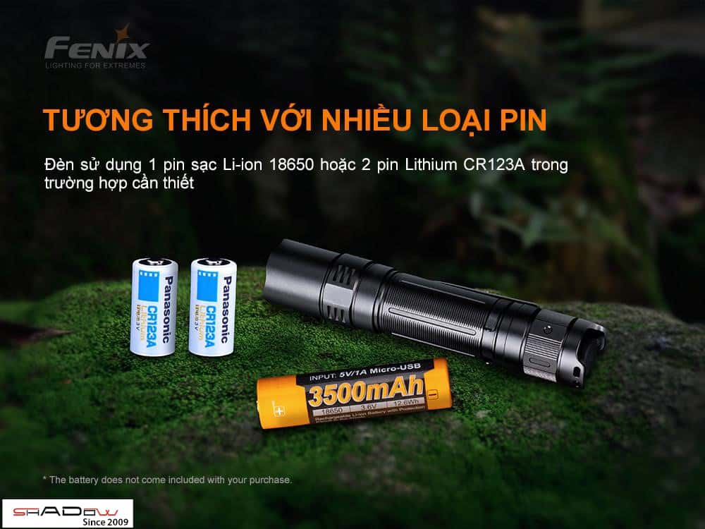 Đèn cấp nguồn bởi một pin sạc Li-ion 18650 (không bao gồm) hoặc hai pin CR123A (không bao gồm).