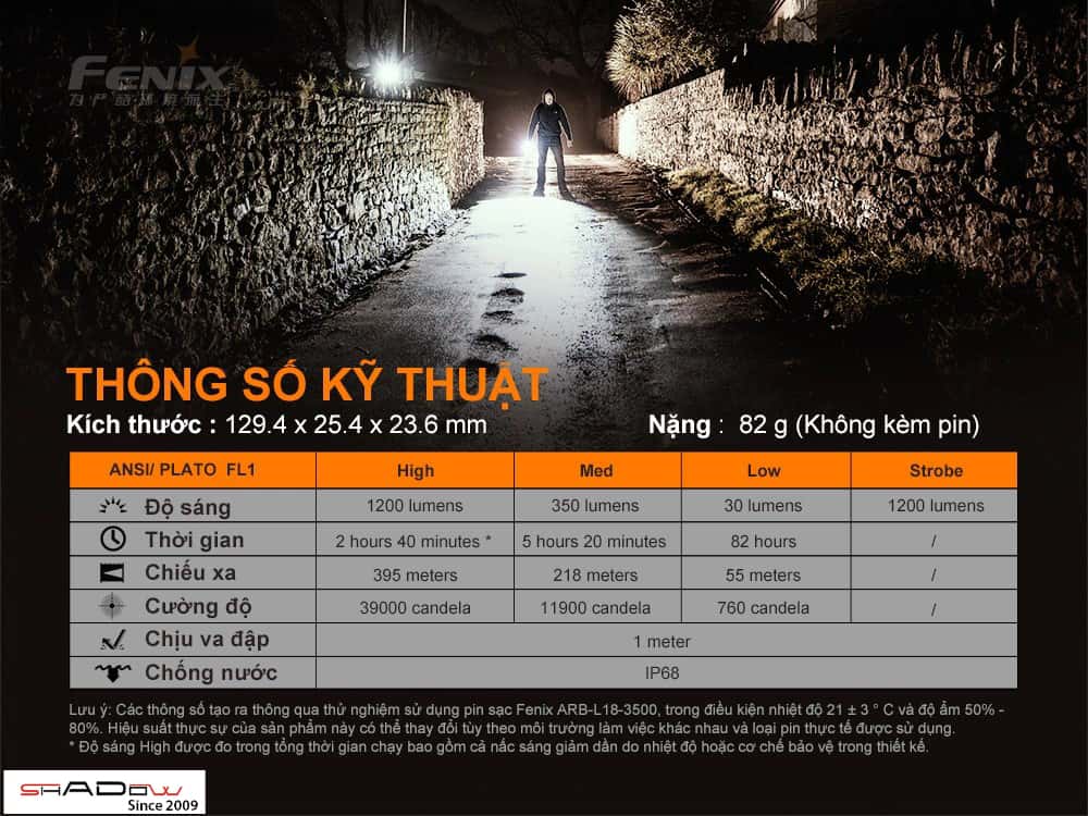 Toàn bộ thông số của đèn được sản xuất theo Tiêu Chuẩn ANSI /PLATO FL1 do Tổ chức thương mại đèn pin chiếu sáng Hoa Kỳ ban hành.