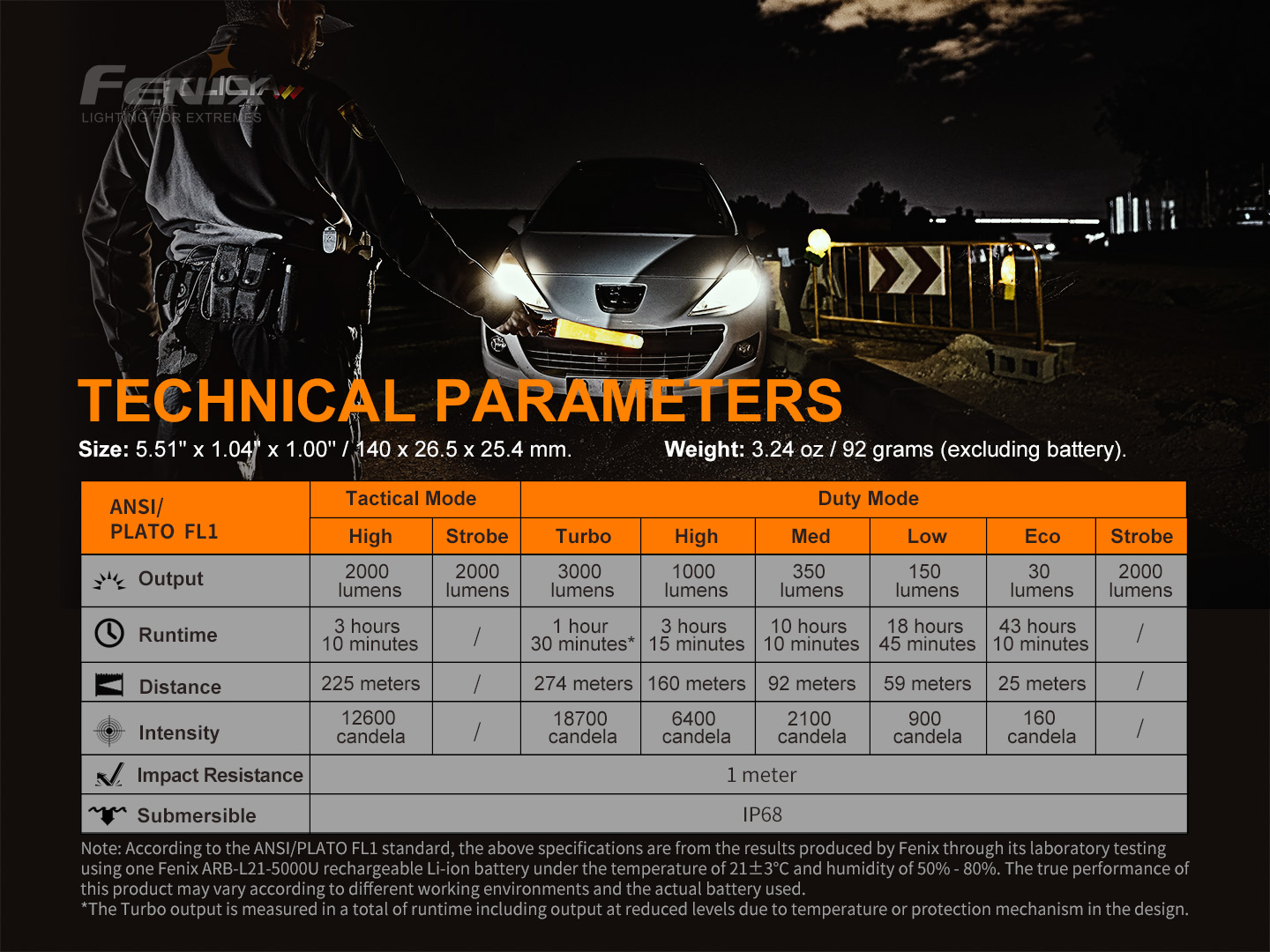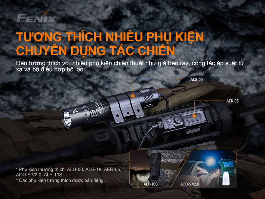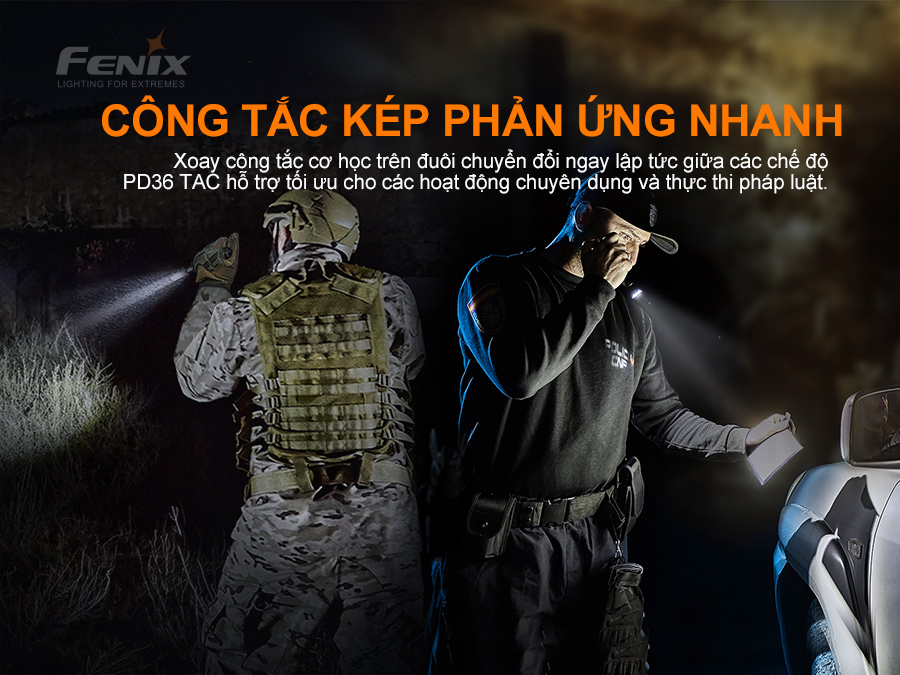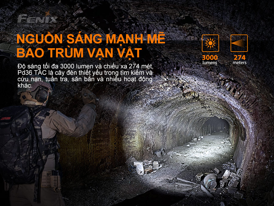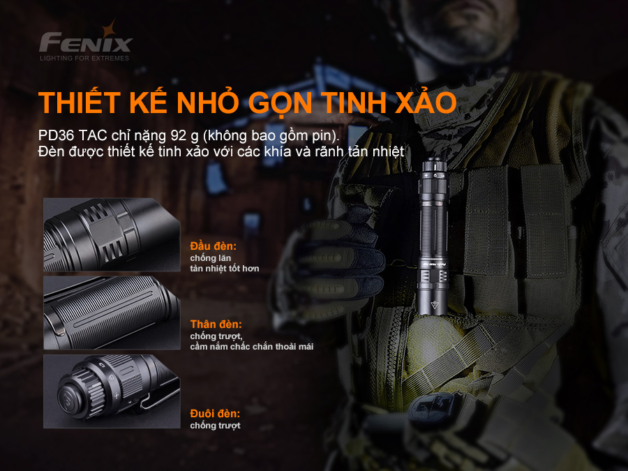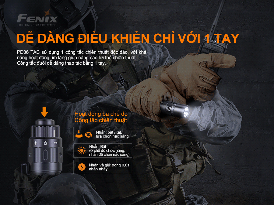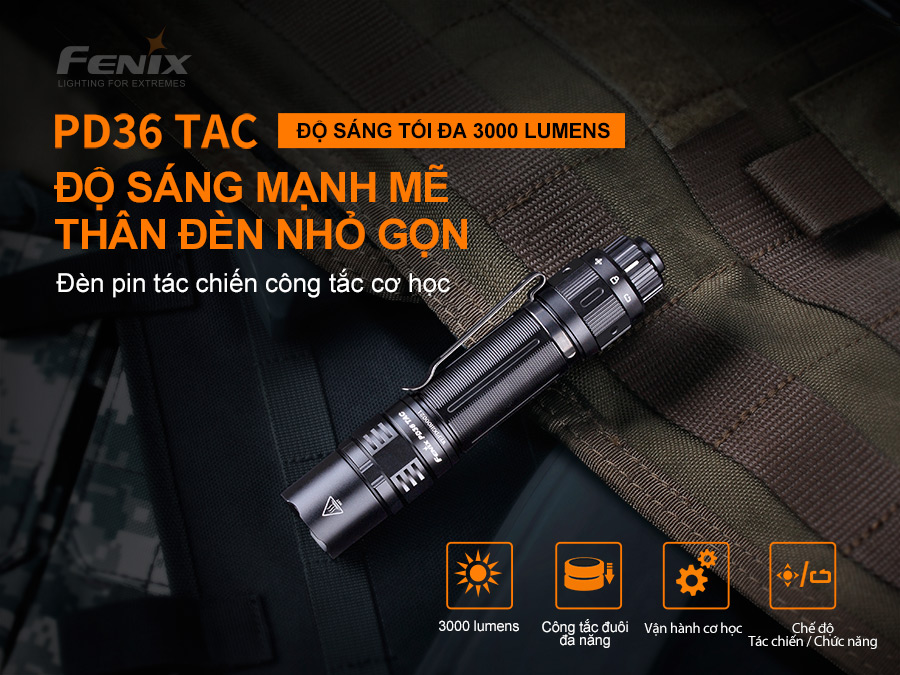 Đèn pin ch-i-ế-n thu-ậ-t Fenix PD36 TAC với thiết kế công tắc cơ xoay trên đuôi giúp nhanh chóng chuyển đổi giữa Chế độ chuyen dụng và chế độ cơ bản.Đèn có độ sáng tối đa 3000 lumen và chiếu xa 274m. Sử dụng 1 pin Li-ion 21700 5000mAh USB. Đèn pin Fenix PD36 TAC có khả năng chống va đập 1m và có chống bụi, nước IP68. Được sản xuất phù hợp cho các hoạt động thực thi ph-á-p lu-ậ-t, sẵn sàng phản ứng với mọi tình huống chi-ế-n th-u-ậ-t.