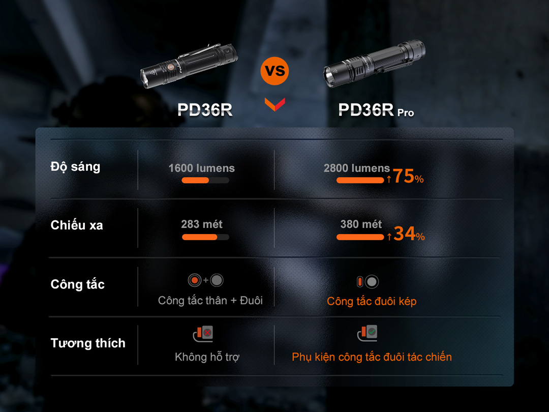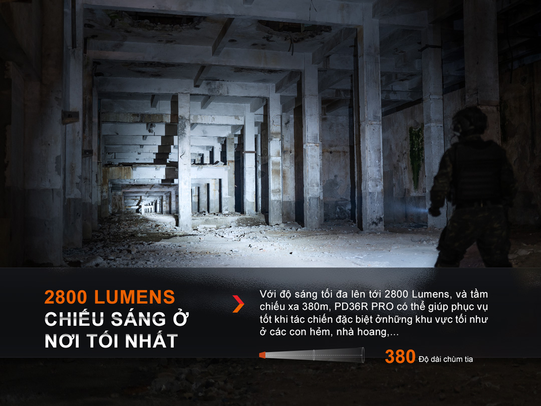 Đèn pin Fenix PD36R Pro là dòng đèn pin t-á-c ch-i-ế-n chuyên nghiệp có tầm chiếu xa 380m và độ sáng là 2800 lumen, . Fenix PD36R Pro được cải tiến thêm nhiều tính năng hơn so với phiên bản PD36R tiền nhiệm. Đặc biệt là công nghệ truyền dẫn APF, giúp hoạt động của ánh sáng và mạch được ổn định ở mọi nơi, mọi thời điểm, công tắc đuôi kép phản ứng nhanh giúp sử dụng ở những trường hợp cần thiết. PD36R Pro có nhiều tính năng thông minh được tích hợp trong cây đèn nhỏ gọn, phù hợp với các nhiệm vụ đặc thù, chuyên dụng,... của lực lượng cô-ng a-n, c-ảnh s-át,...