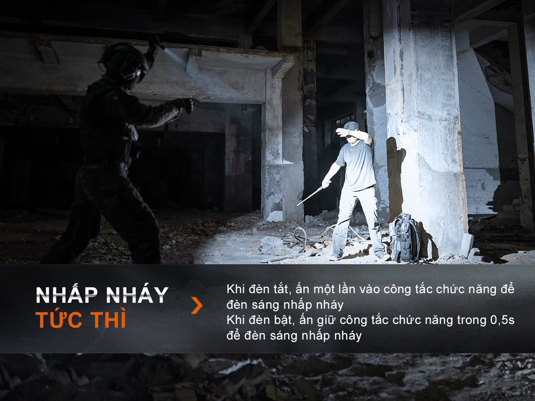 Khi đèn đang mở, ấn giữ công tắc chức năng trong 0.5s để đèn sáng nhấp nháy liên tục, ấn vào công tắc thêm 1 lần nữa để về lại chế độ ban đầu