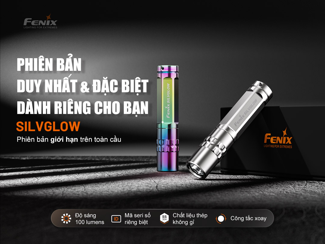 Đèn pin EDC FENIX SILVGLOW phiên bản giới hạn, sử dụng 1 LED Luminus SST12 cho chùm sáng tối đa 100 lumens và tầm chiếu xa lên tới 54m, sử dụng 1 pin AAA cho thời gian sử dụng lên tới 25 giờ. Thân đèn được gia công CNC toàn bộ từ kim loại bền bỉ, bề mặt được đánh bóng giúp cho độ bền trở lên cứng cáp và bển bỉ hơn, được thiết kế giới hạn và được đánh số riêng biệt (thích hợp để sưu tầm), đèn phù hợp cho các hoạt động thường ngày, đi dạo, sưu tầm.vv